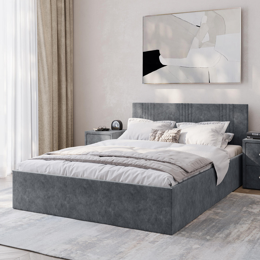 Кровать «Элис» выполнена в мягкой обивке из практичного и износостойкого велюра. Прямая спинка украшена декоративной стежкой, добавляющей стиля и динамики в интерьер. Особо прочный бельевой ящик позволит хранить в кровати даже самые тяжелые предметы и вещи. Надёжное основание и анатомическая решётка на подъёмных газлифтах обеспечат оптимальный уровень комфорта во время сна.