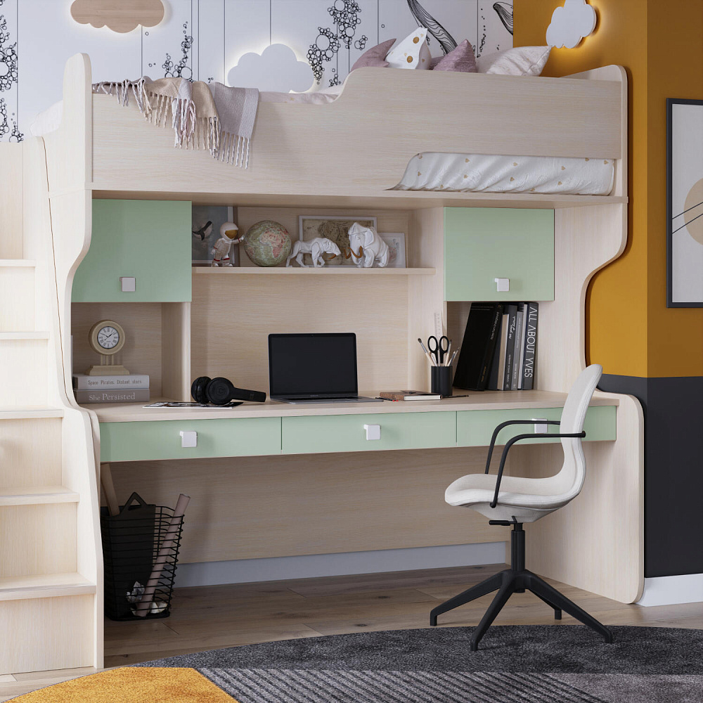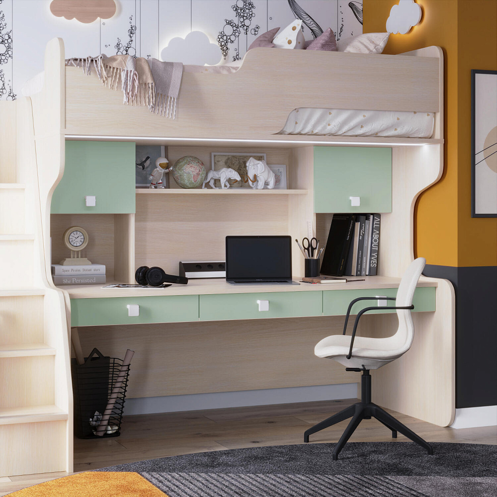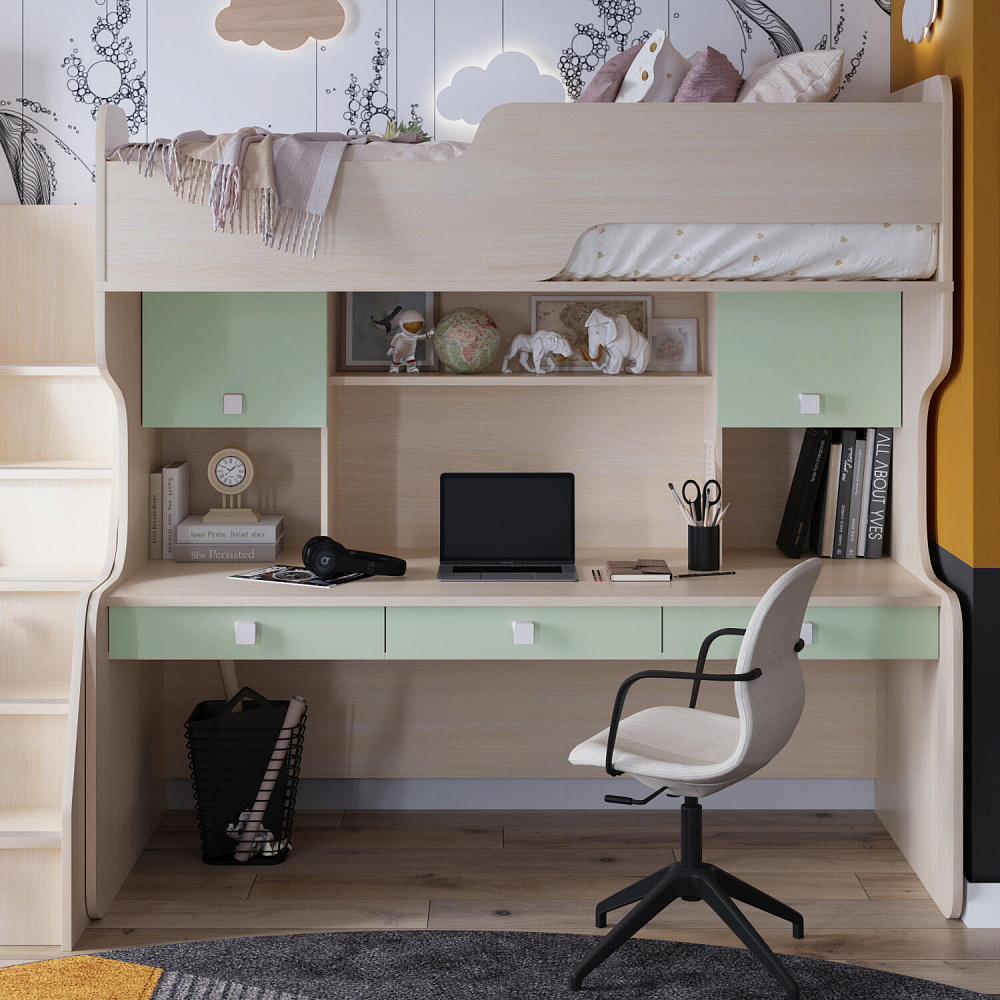 Продуманная двухместная рабочая зона с системой хранения. Под кроватью есть просторная столешница с отверстием для проводов, три выдвижных ящика, два шкафа и открытые полки. Рабочее место будет удобно как для одного, так и для двоих детей, места хватит всем учебным материалам и аксессуарам.