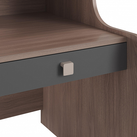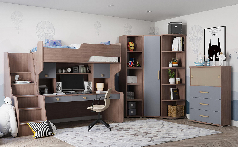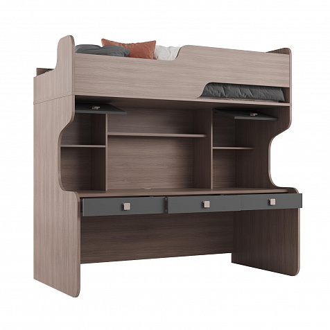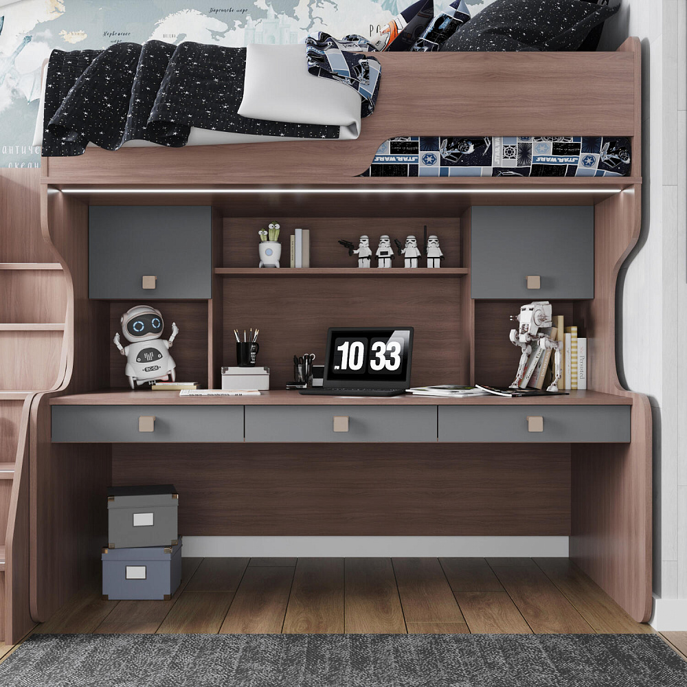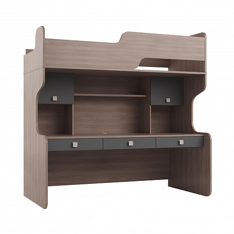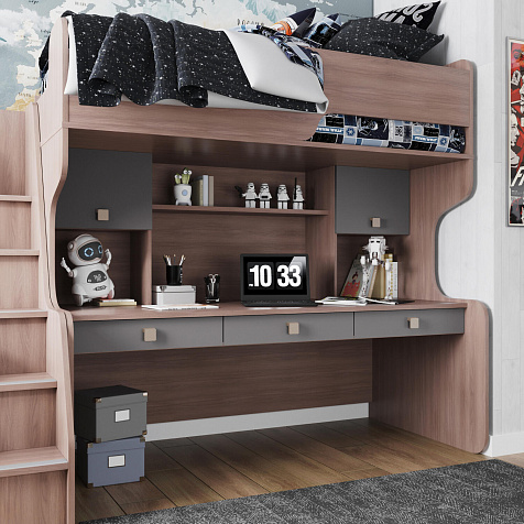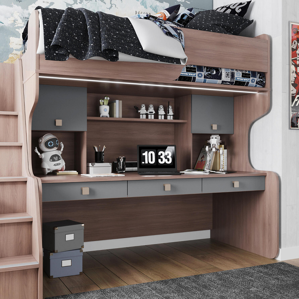 Продуманная двухместная рабочая зона с системой хранения. Под кроватью есть просторная столешница с отверстием для проводов, три выдвижных ящика, два шкафа и открытые полки. Рабочее место будет удобно как для одного, так и для двоих детей, места хватит всем учебным материалам и аксессуарам.
