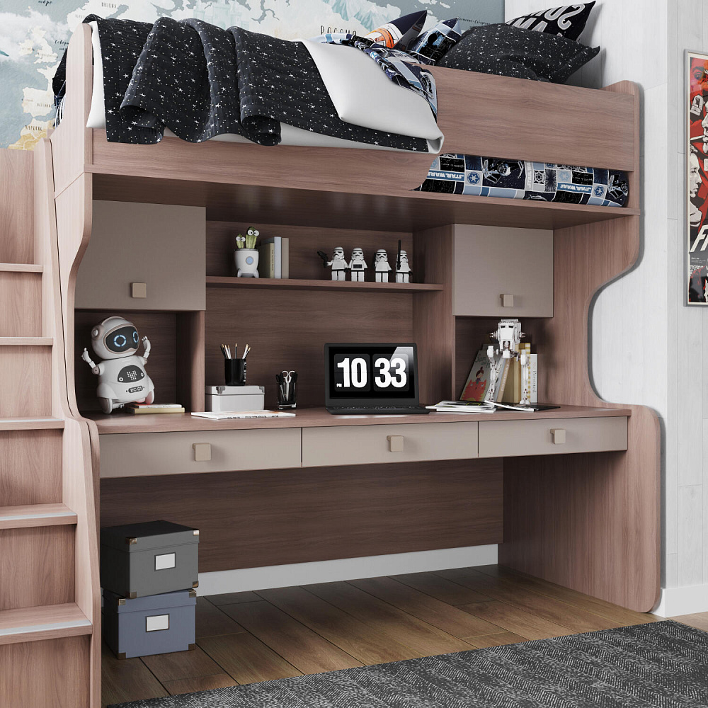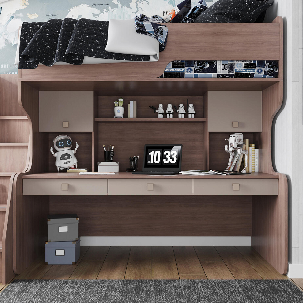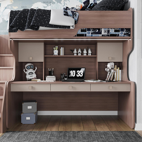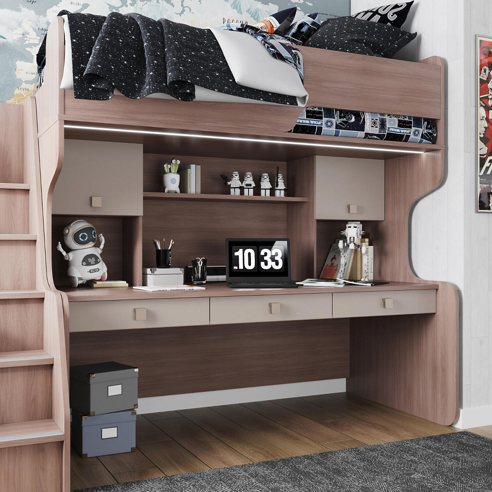 Продуманная двухместная рабочая зона с системой хранения. Под кроватью есть просторная столешница с отверстием для проводов, три выдвижных ящика, два шкафа и открытые полки. Рабочее место будет удобно как для одного, так и для двоих детей, места хватит всем учебным материалам и аксессуарам.