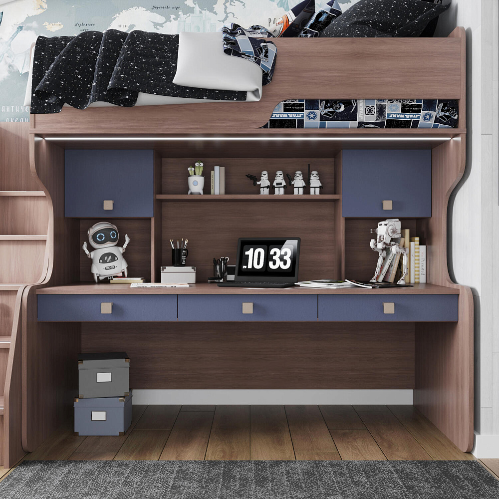 Продуманная двухместная рабочая зона с системой хранения. Под кроватью есть просторная столешница с отверстием для проводов, три выдвижных ящика, два шкафа и открытые полки. Рабочее место будет удобно как для одного, так и для двоих детей, места хватит всем учебным материалам и аксессуарам.