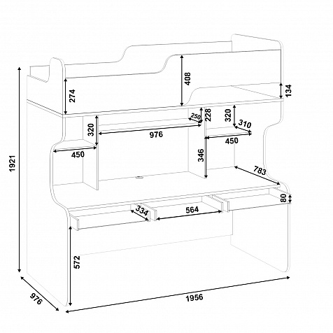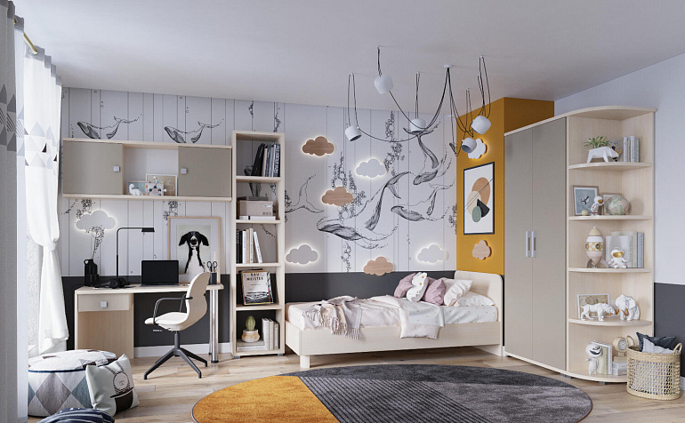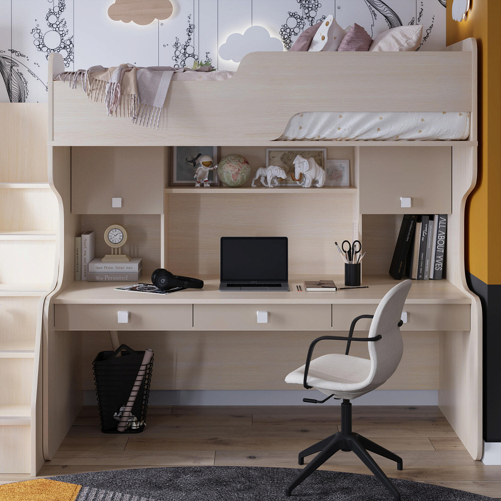 Продуманная двухместная рабочая зона с системой хранения. Под кроватью есть просторная столешница с отверстием для проводов, три выдвижных ящика, два шкафа и открытые полки. Рабочее место будет удобно как для одного, так и для двоих детей, места хватит всем учебным материалам и аксессуарам.