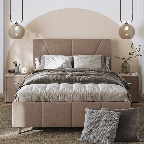 Мягкая кровать «Каролина» для тех, кому важен здоровый сон и эстетичный вид мебели. Дизайн отличается диагональными и прямыми строчками и слегка изогнутым изголовьем. Возвышение на ножках добавит в интерьер динамики и лёгкости. Кровать также поможет сэкономить пространство квартиры благодаря вместительному бельевому коробу под решёткой.