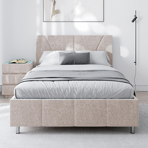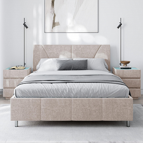 Мягкая кровать «Каролина» для тех, кому важен здоровый сон и эстетичный вид мебели. Дизайн отличается диагональными и прямыми строчками и слегка изогнутым изголовьем. Возвышение на ножках добавит в интерьер динамики и лёгкости. Кровать также поможет сэкономить пространство квартиры благодаря вместительному бельевому коробу под решёткой.