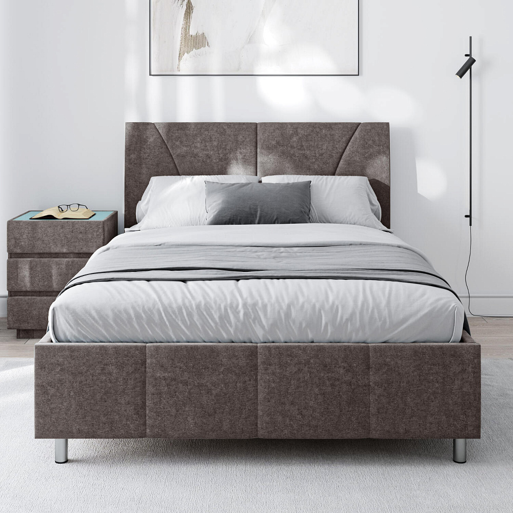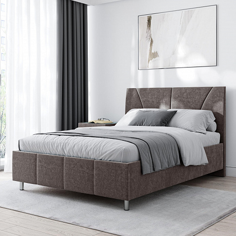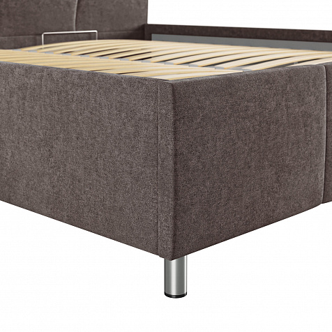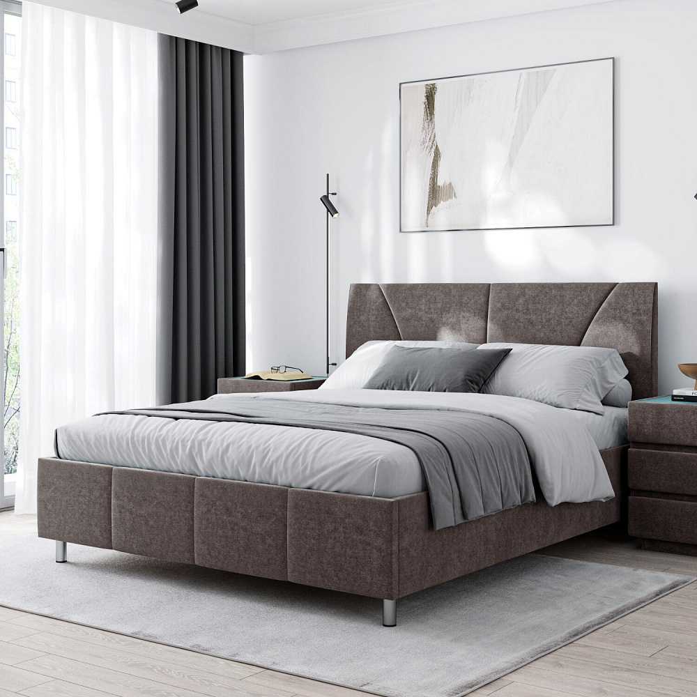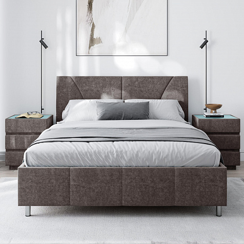 Мягкая кровать «Каролина» для тех, кому важен здоровый сон и эстетичный вид мебели. Дизайн отличается диагональными и прямыми строчками и слегка изогнутым изголовьем. Возвышение на ножках добавит в интерьер динамики и лёгкости. Кровать также поможет сэкономить пространство квартиры благодаря вместительному бельевому коробу под решёткой.