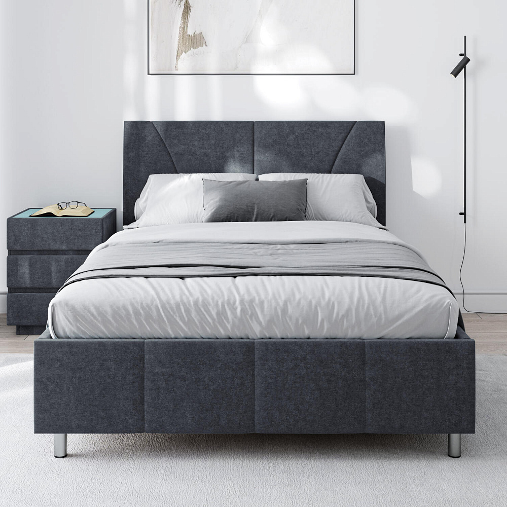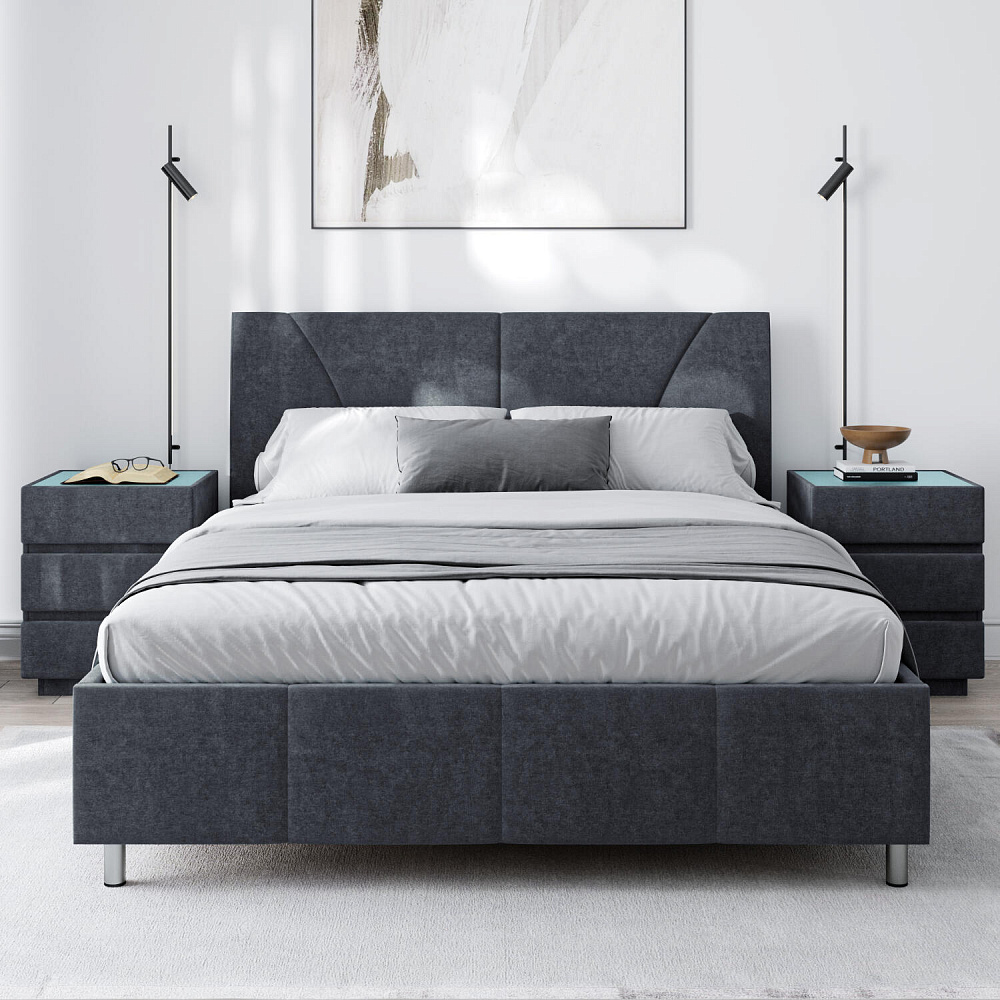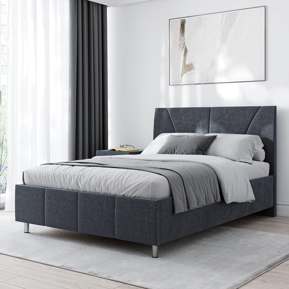 Мягкая кровать «Каролина» для тех, кому важен здоровый сон и эстетичный вид мебели. Дизайн отличается диагональными и прямыми строчками и слегка изогнутым изголовьем. Возвышение на ножках добавит в интерьер динамики и лёгкости. Кровать также поможет сэкономить пространство квартиры благодаря вместительному бельевому коробу под решёткой.