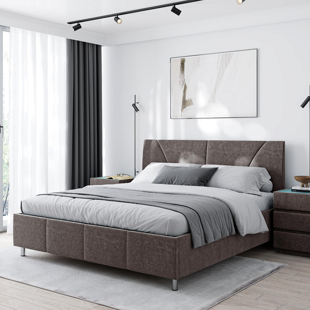 Мягкая кровать «Каролина» для тех, кому важен здоровый сон и эстетичный вид мебели. Дизайн отличается диагональными и прямыми строчками и слегка изогнутым изголовьем. Возвышение на ножках добавит в интерьер динамики и лёгкости. Кровать также поможет сэкономить пространство квартиры благодаря вместительному бельевому коробу под решёткой.