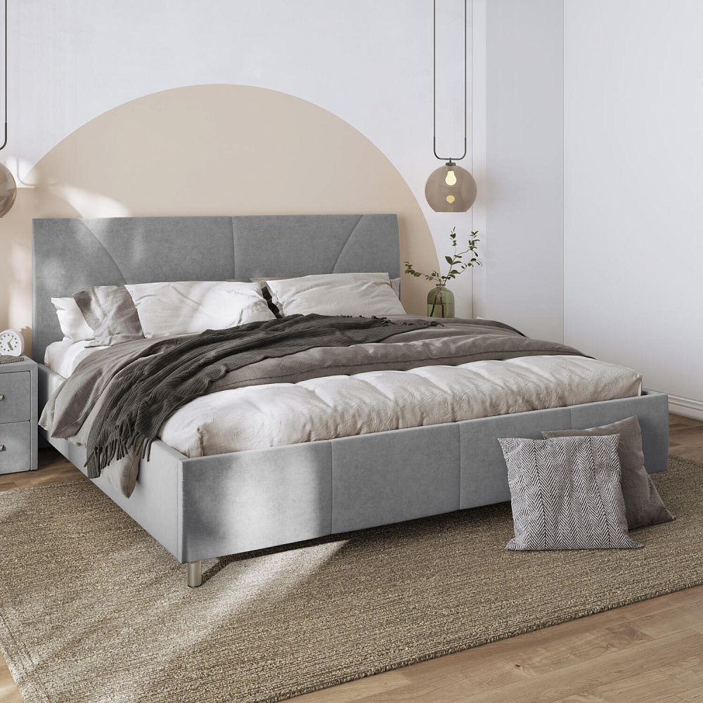 Мягкая кровать «Каролина» для тех, кому важен здоровый сон и эстетичный вид мебели. Дизайн отличается диагональными и прямыми строчками и слегка изогнутым изголовьем. Возвышение на ножках добавит в интерьер динамики и лёгкости. Кровать также поможет сэкономить пространство квартиры благодаря вместительному бельевому коробу под решёткой.