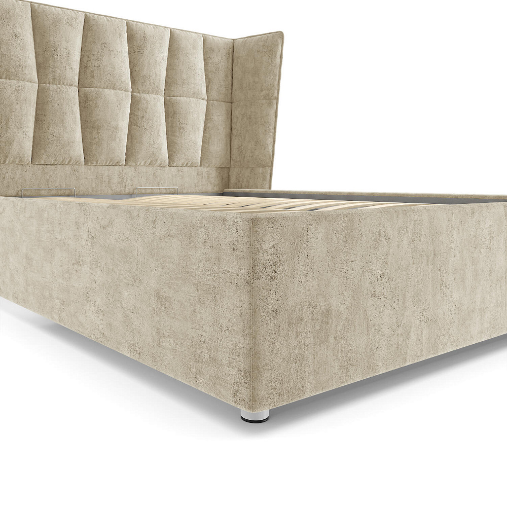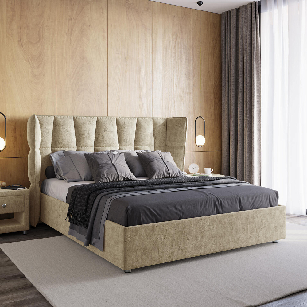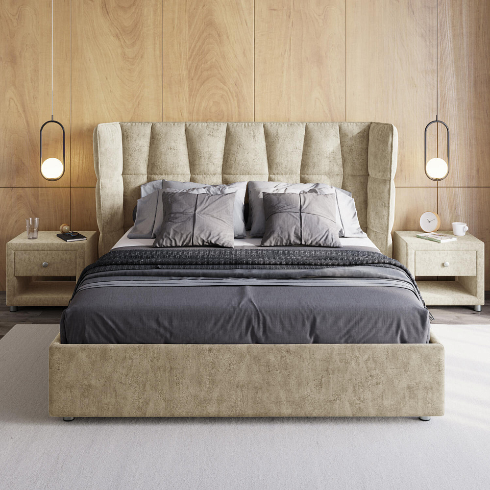 Мягкая кровать «Дарина» станет центральным местом местом современной спальни благодаря оригинальному дизайну. Высокое мягкое изголовье со стежкой в форме трапеций преобразит интерьер спальни и создаст комфортную зону для чтения и просмотра кино. Кровать поможет сэкономить пространство комнаты за счет вместительного бельевого короба под решеткой. Надежное основание и правильно подобранный матрас обеспечат необходимый уровень комфорта для здорового сна и отдыха.