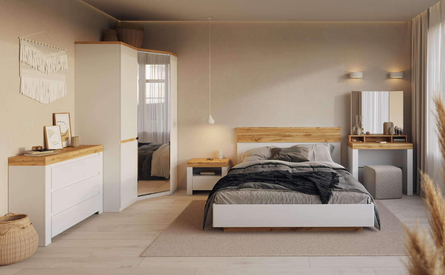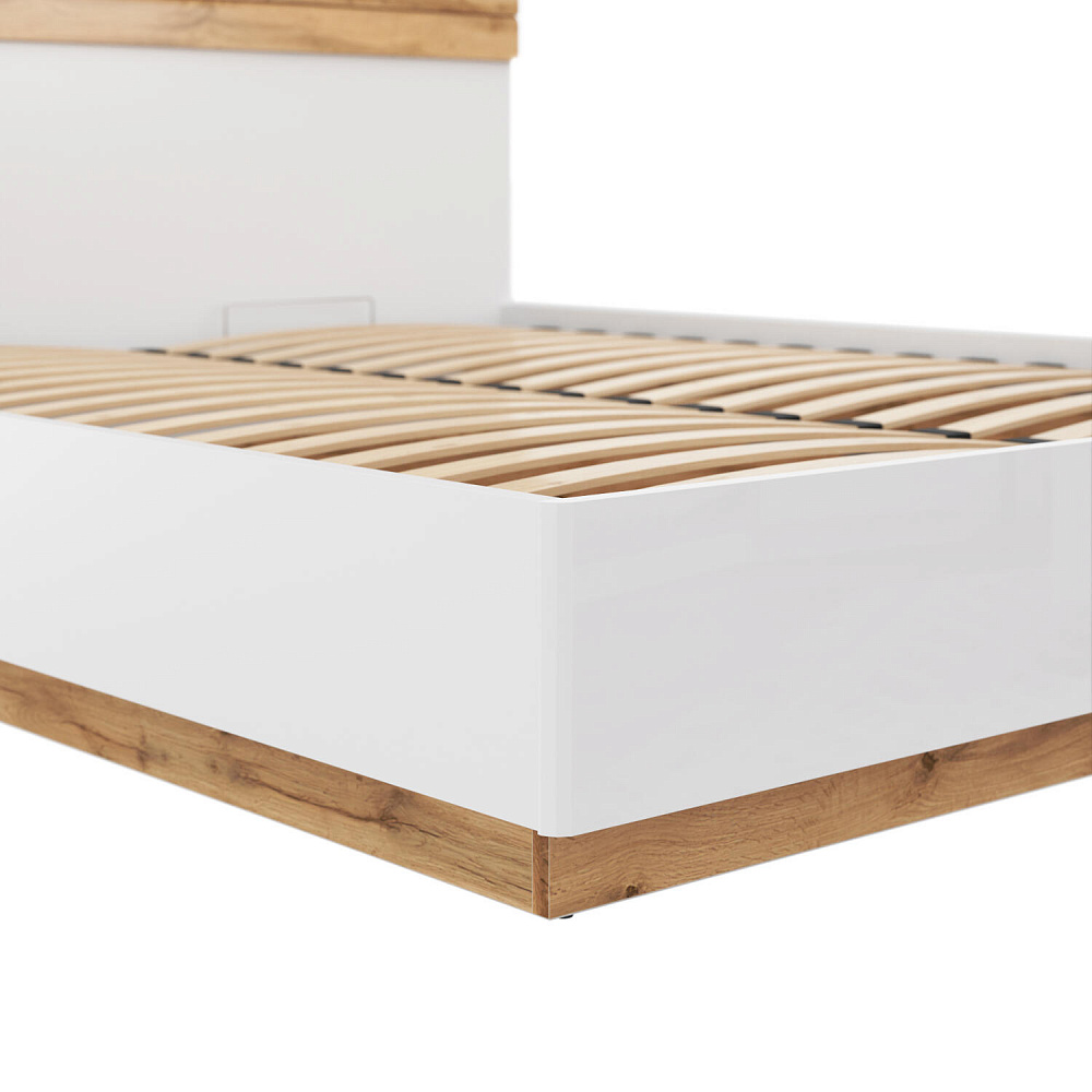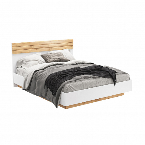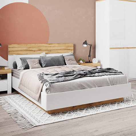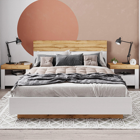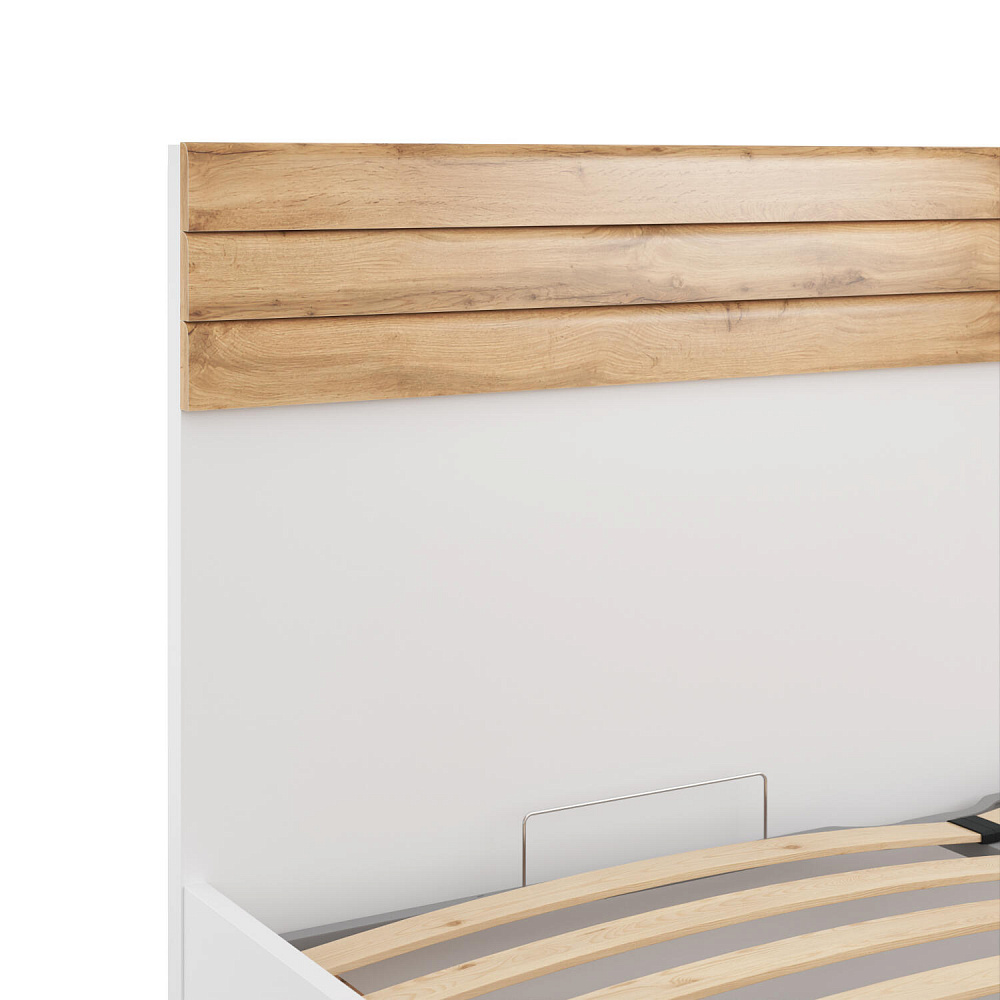 Лаконичный дизайн. Сочетание белого корпуса с реечными вставками на изголовье в цвете «Дуб вотан» поможет создать гармоничную обстановку в спальне.