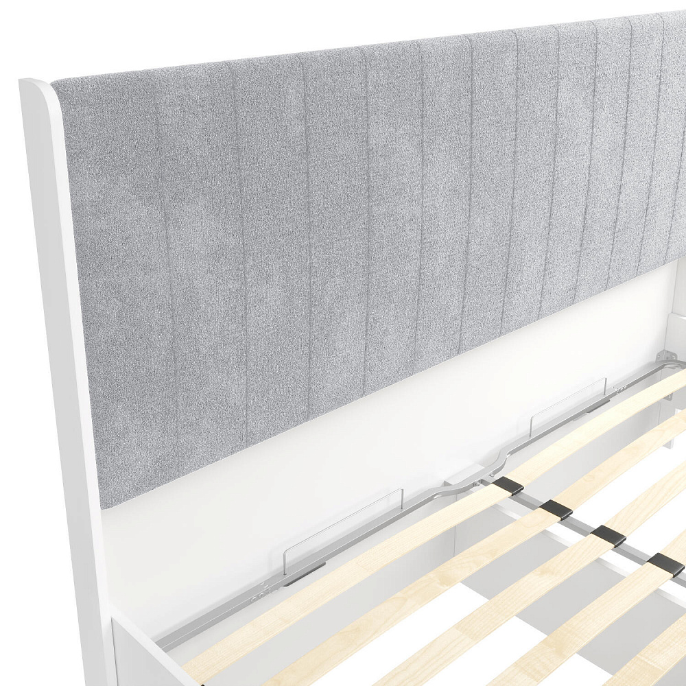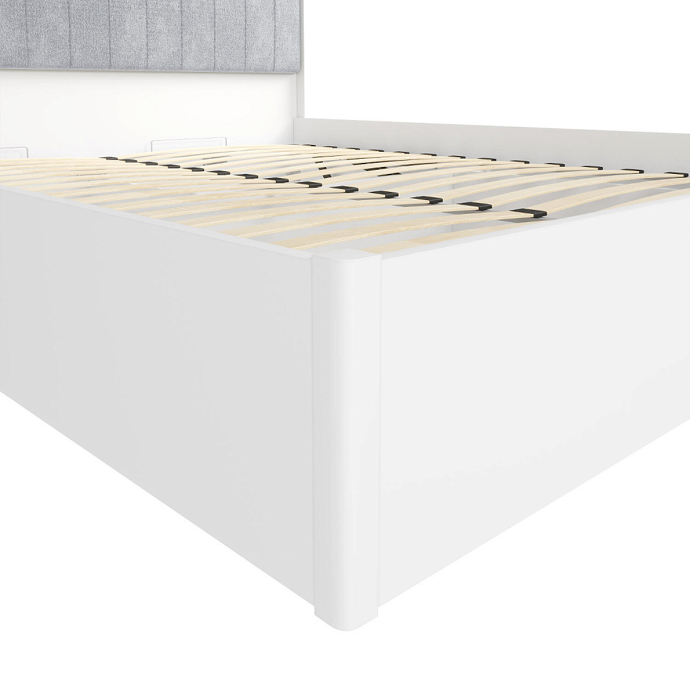 - Изголовье в ткани букле. Спинка кровати выполнена в обивке из буклированной ткани Clarins. Она приятна на ощупь, практична в использовании и уходе, безопасна для взрослых и детей.