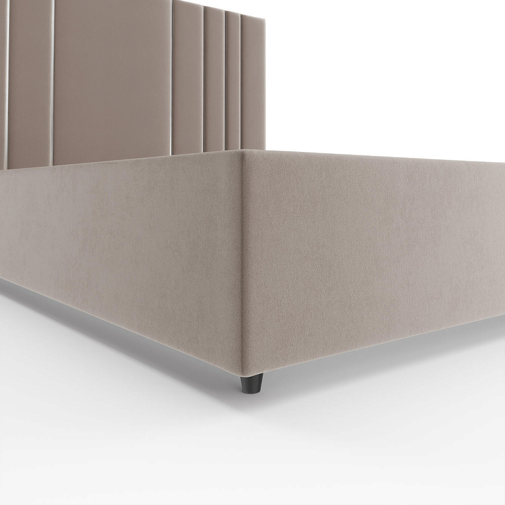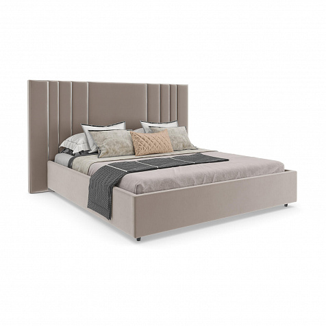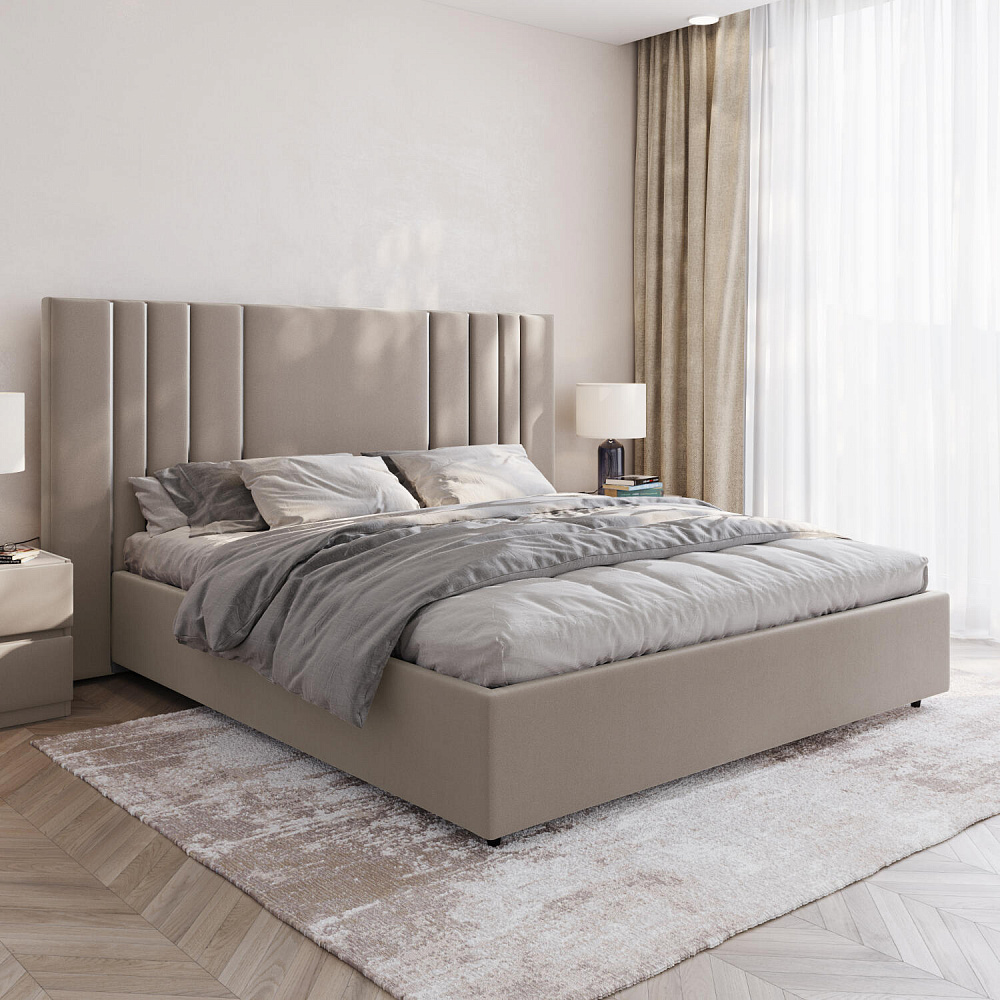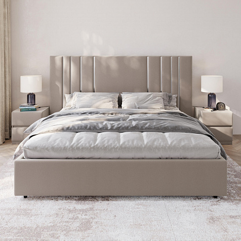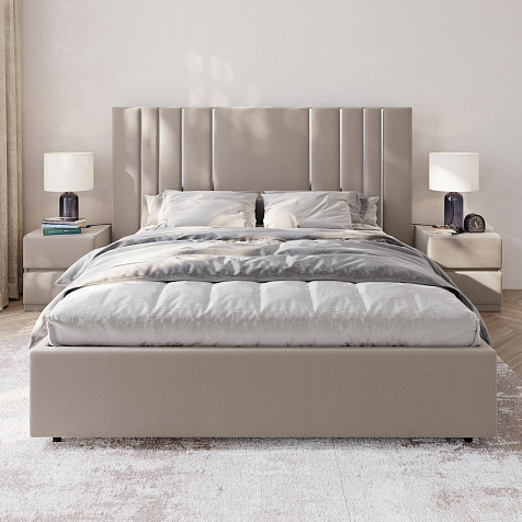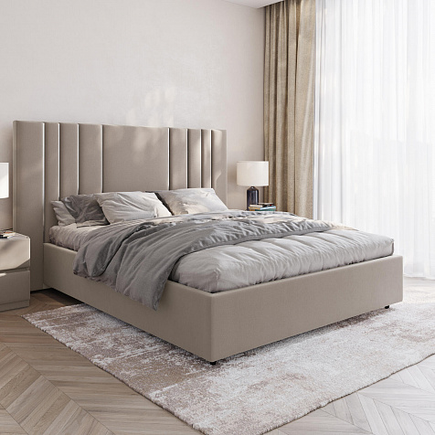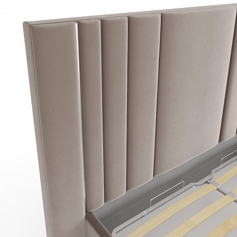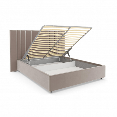 Мягкая кровать «Рания» создана для воплощения смелых интерьерных решений. Высокое изголовье декорировано узором из вертикальных металлизированных вставок, утопающих в изголовье. Под решёткой с подъёмным механизмом предусмотрен вместительный бельевой короб. Надежное основание и правильно подобранный матрас обеспечат необходимый уровень для здорового сна и отдыха.