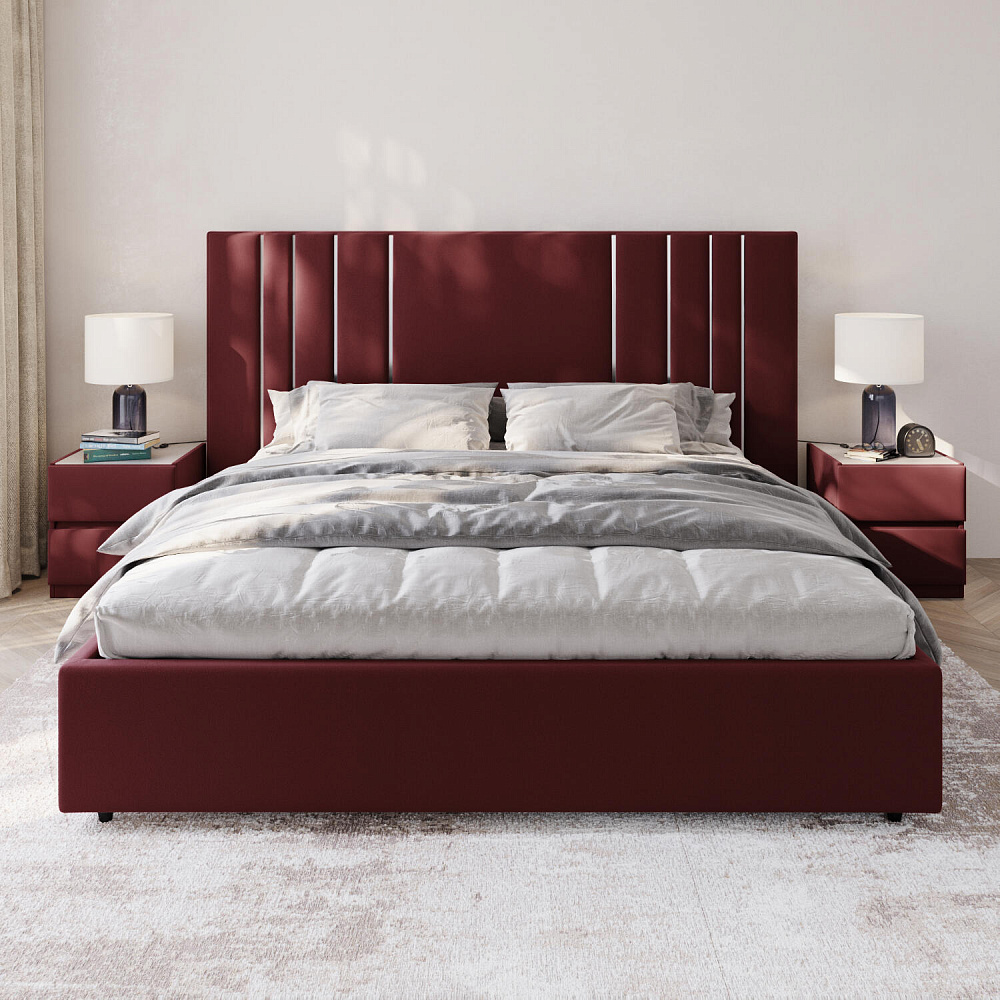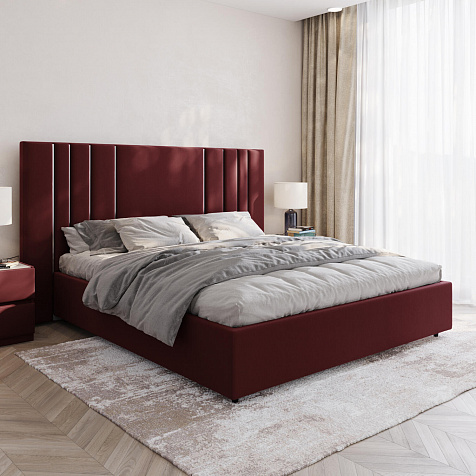 Мягкая кровать «Рания» создана для воплощения смелых интерьерных решений. Высокое изголовье декорировано узором из вертикальных металлизированных вставок, утопающих в изголовье. Под решёткой с подъёмным механизмом предусмотрен вместительный бельевой короб. Надежное основание и правильно подобранный матрас обеспечат необходимый уровень для здорового сна и отдыха.