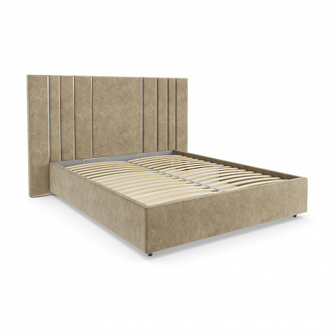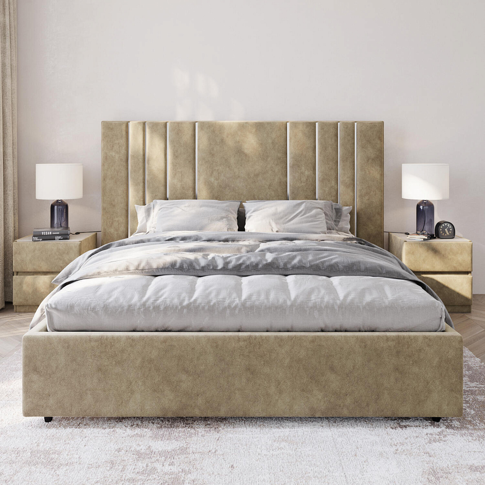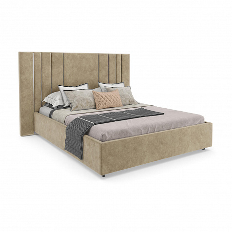 Мягкая кровать «Рания» создана для воплощения смелых интерьерных решений. Высокое изголовье декорировано узором из вертикальных металлизированных вставок, утопающих в изголовье. Под решёткой с подъёмным механизмом предусмотрен вместительный бельевой короб. Надежное основание и правильно подобранный матрас обеспечат необходимый уровень для здорового сна и отдыха.
