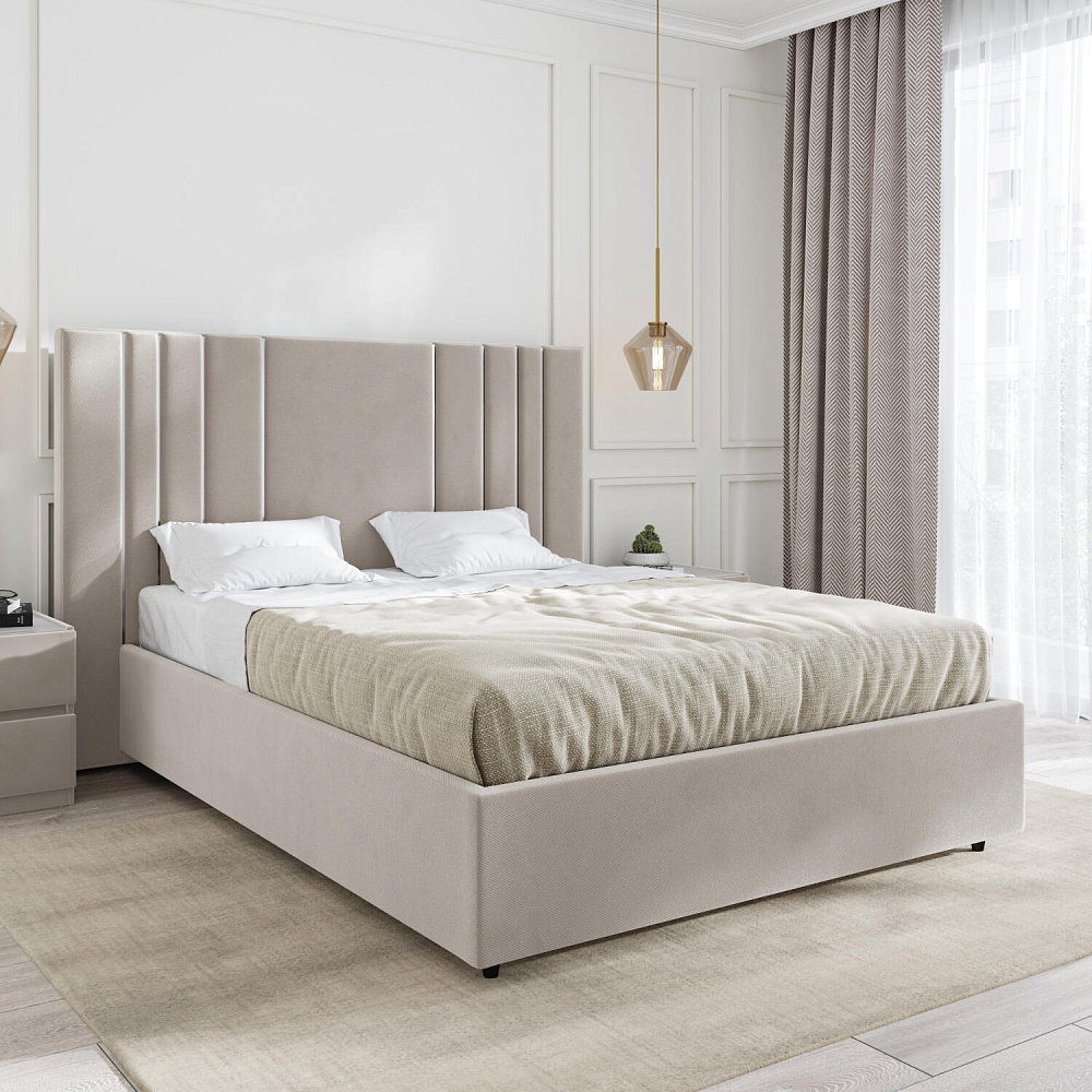 Мягкая кровать «Рания» создана для воплощения смелых интерьерных решений. Высокое изголовье декорировано узором из вертикальных металлизированных вставок, утопающих в изголовье. Под решёткой с подъёмным механизмом предусмотрен вместительный бельевой короб. Надежное основание и правильно подобранный матрас обеспечат необходимый уровень для здорового сна и отдыха.
