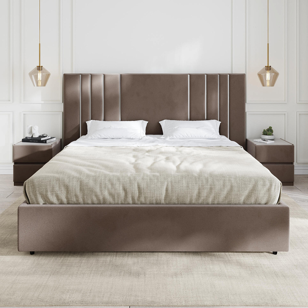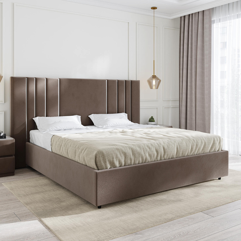 Мягкая кровать «Рания» создана для воплощения смелых интерьерных решений. Высокое изголовье декорировано узором из вертикальных металлизированных вставок, утопающих в изголовье. Под решёткой с подъёмным механизмом предусмотрен вместительный бельевой короб. Надежное основание и правильно подобранный матрас обеспечат необходимый уровень для здорового сна и отдыха.