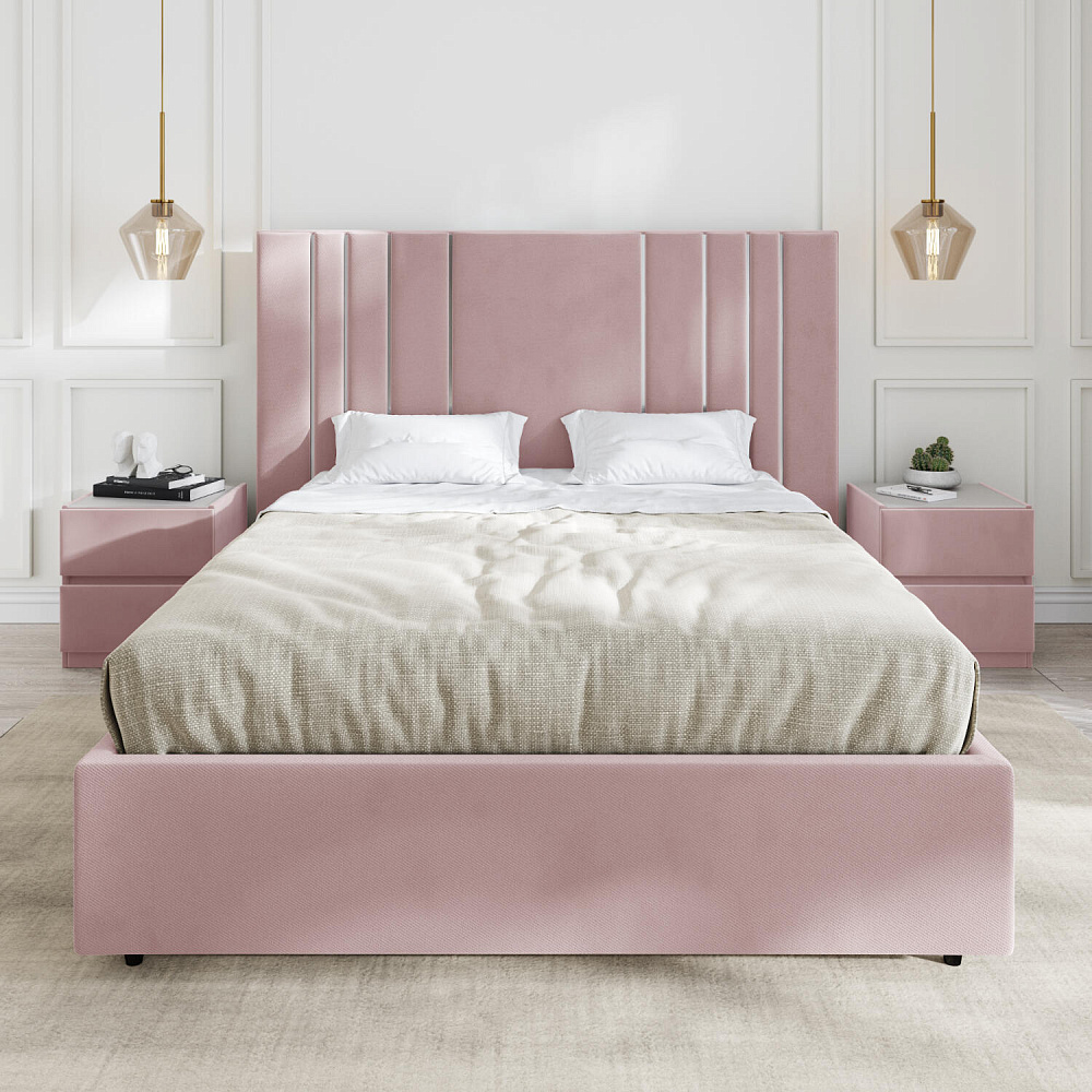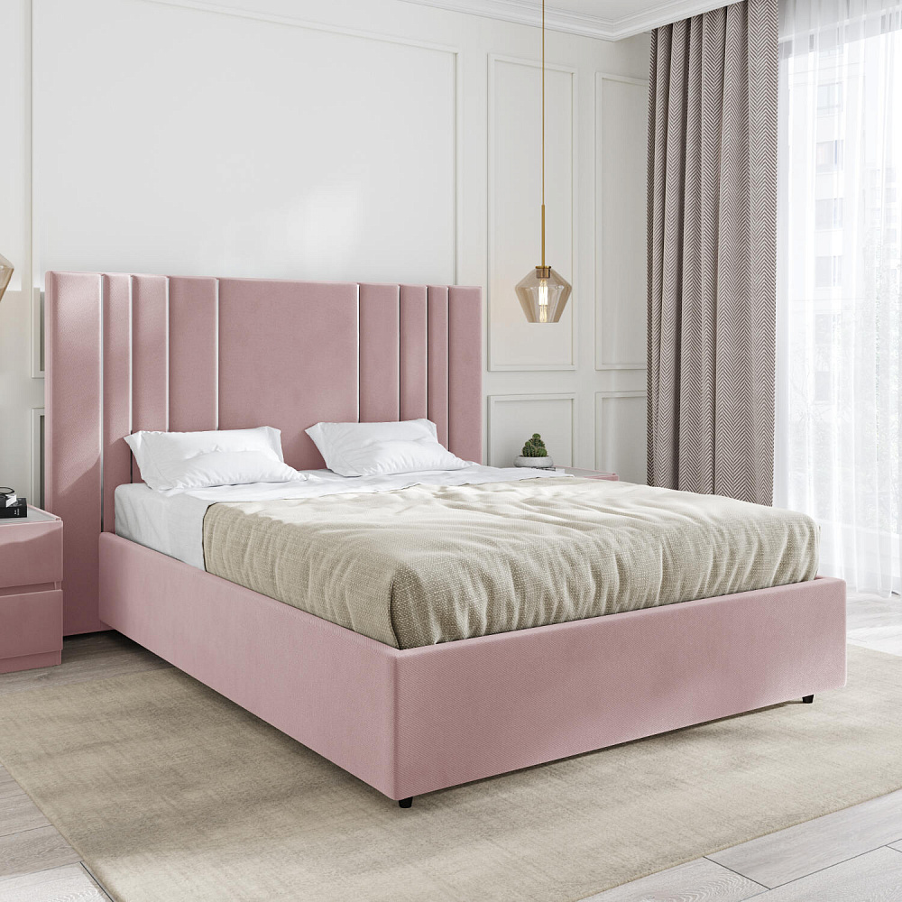 Мягкая кровать «Рания» создана для воплощения смелых интерьерных решений. Высокое изголовье декорировано узором из вертикальных металлизированных вставок, утопающих в изголовье. Под решёткой с подъёмным механизмом предусмотрен вместительный бельевой короб. Надежное основание и правильно подобранный матрас обеспечат необходимый уровень для здорового сна и отдыха.