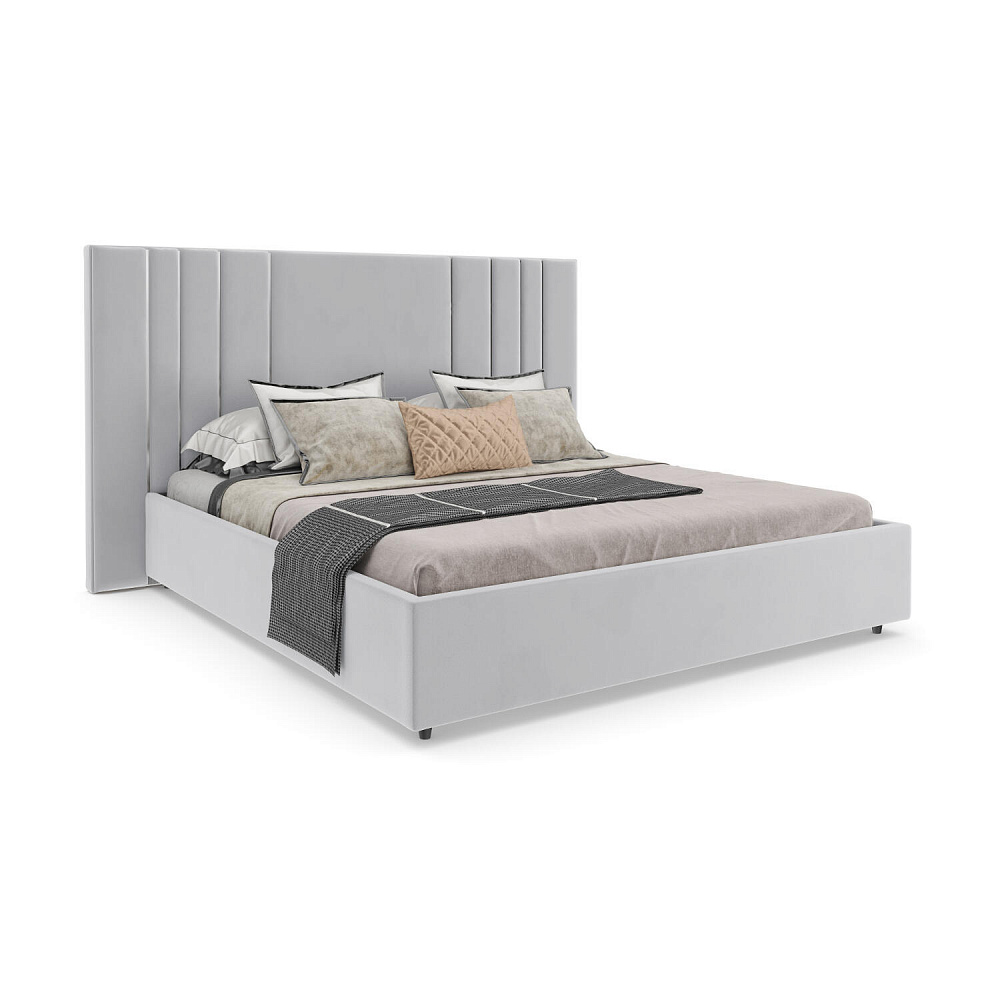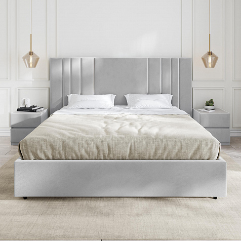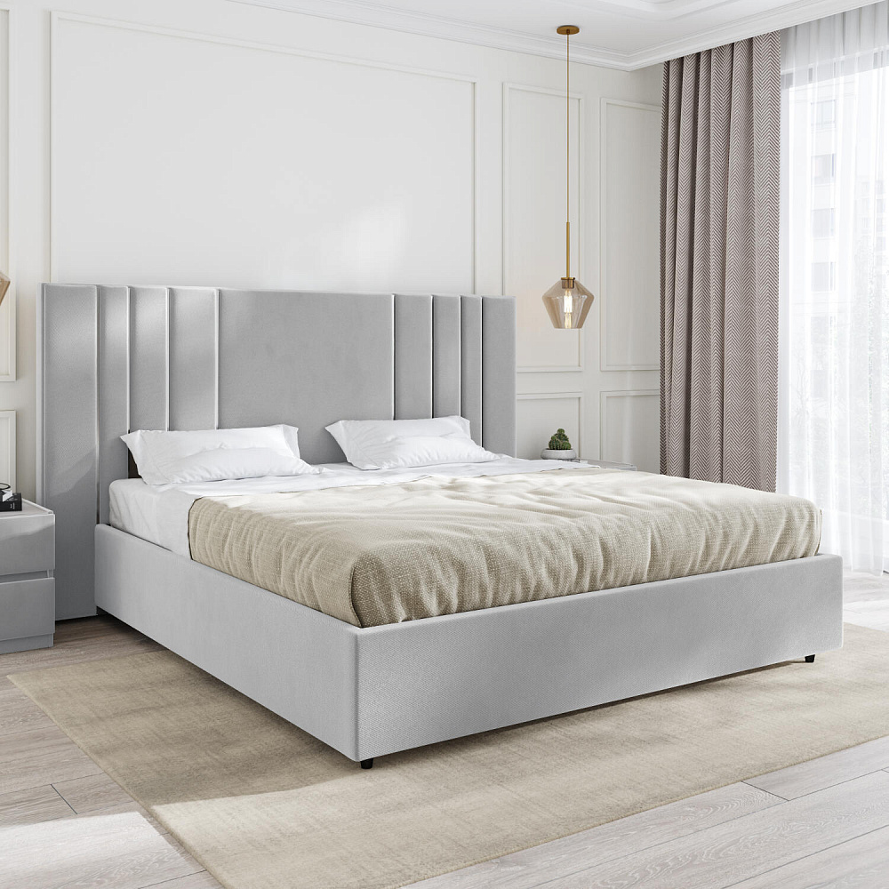 Мягкая кровать «Рания» создана для воплощения смелых интерьерных решений. Высокое изголовье декорировано узором из вертикальных металлизированных вставок, утопающих в изголовье. Под решёткой с подъёмным механизмом предусмотрен вместительный бельевой короб. Надежное основание и правильно подобранный матрас обеспечат необходимый уровень для здорового сна и отдыха.