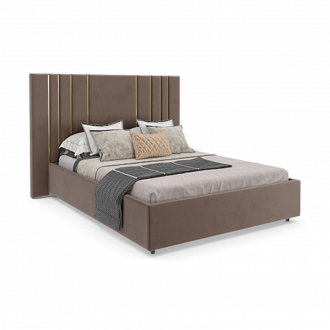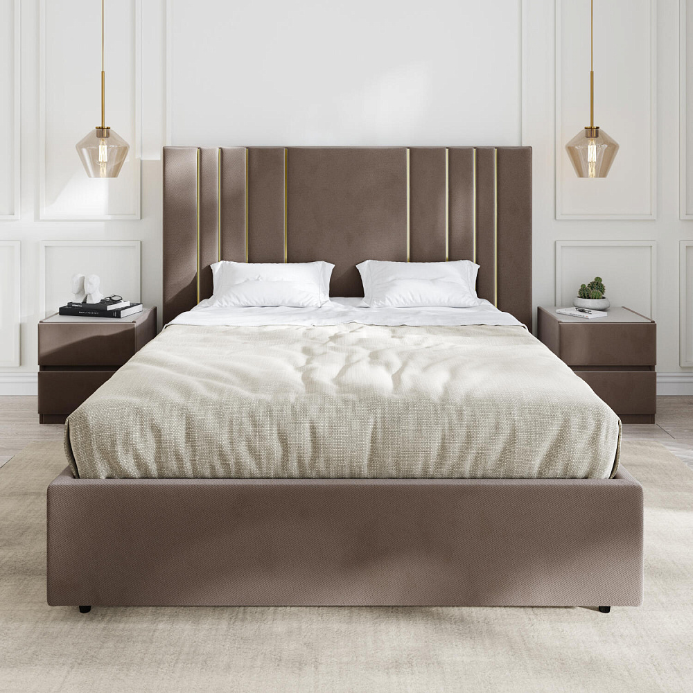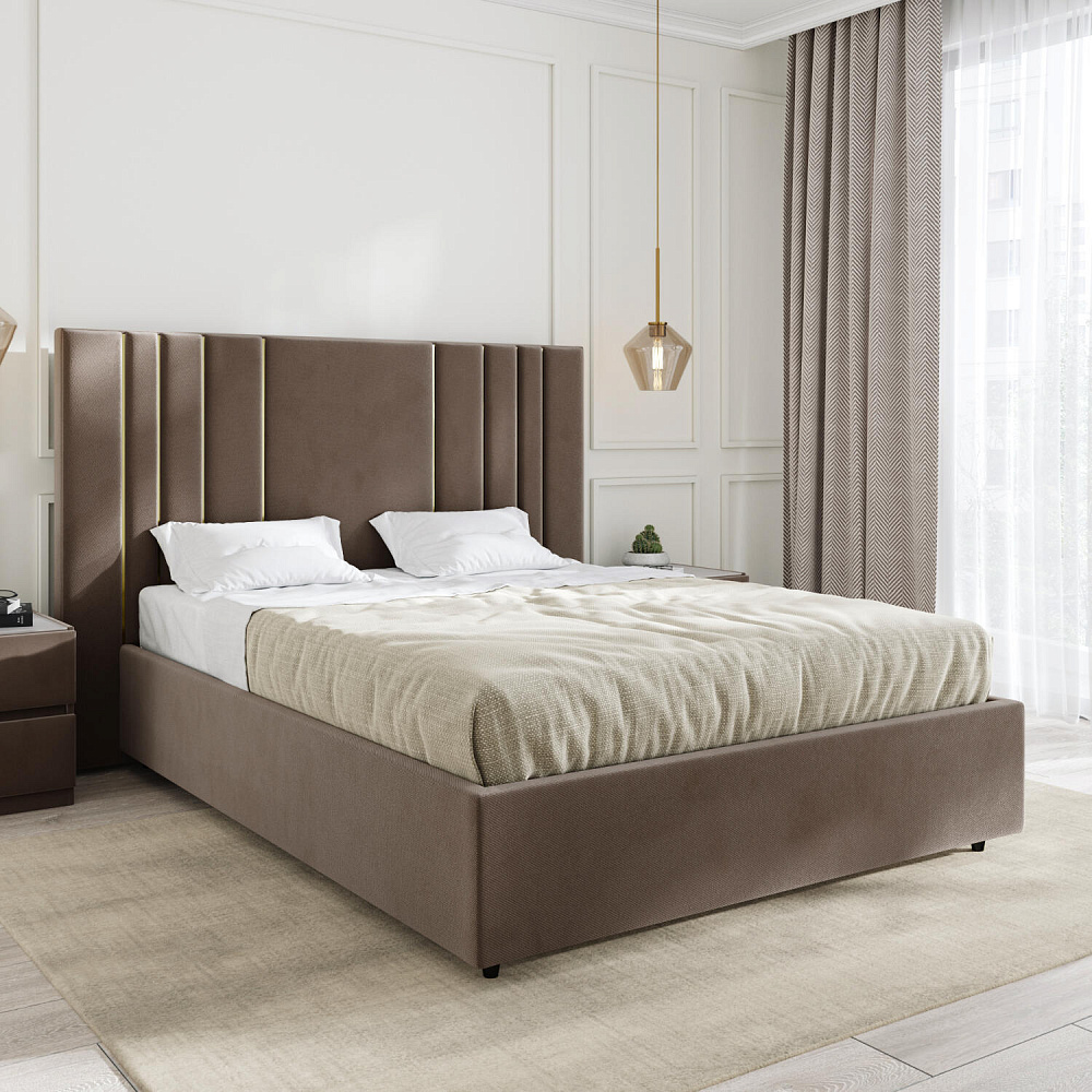 Мягкая кровать «Рания» создана для воплощения смелых интерьерных решений. Высокое изголовье декорировано узором из вертикальных металлизированных вставок, утопающих в изголовье. Под решёткой с подъёмным механизмом предусмотрен вместительный бельевой короб. Надежное основание и правильно подобранный матрас обеспечат необходимый уровень для здорового сна и отдыха.