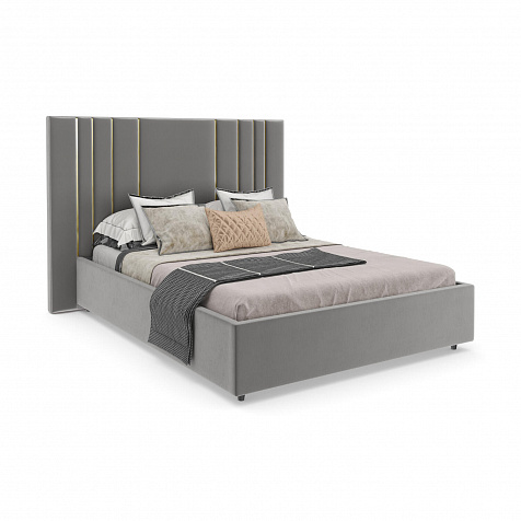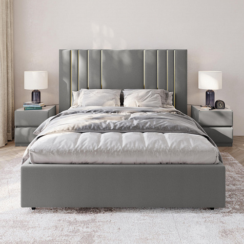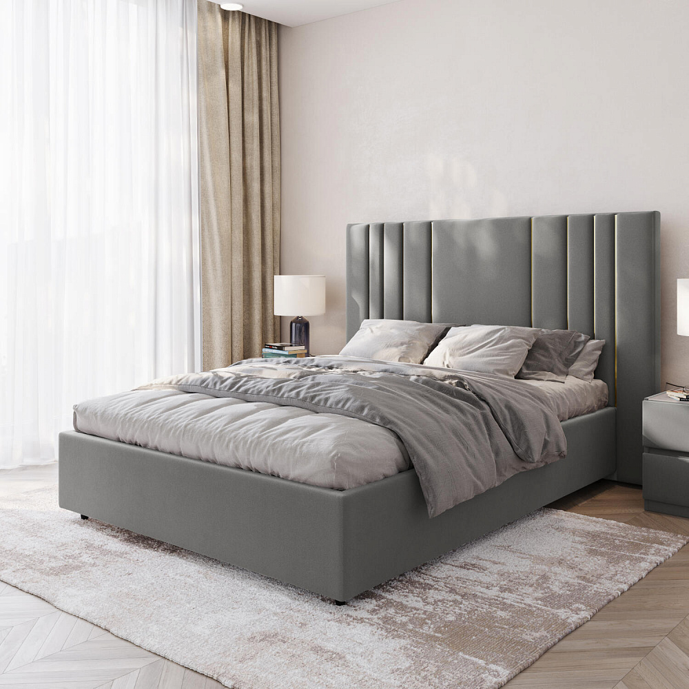 Мягкая кровать «Рания» создана для воплощения смелых интерьерных решений. Высокое изголовье декорировано узором из вертикальных металлизированных вставок, утопающих в изголовье. Под решёткой с подъёмным механизмом предусмотрен вместительный бельевой короб. Надежное основание и правильно подобранный матрас обеспечат необходимый уровень для здорового сна и отдыха.