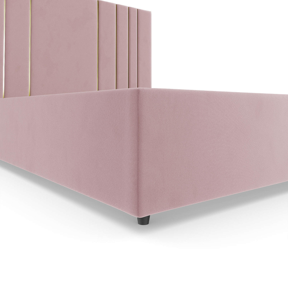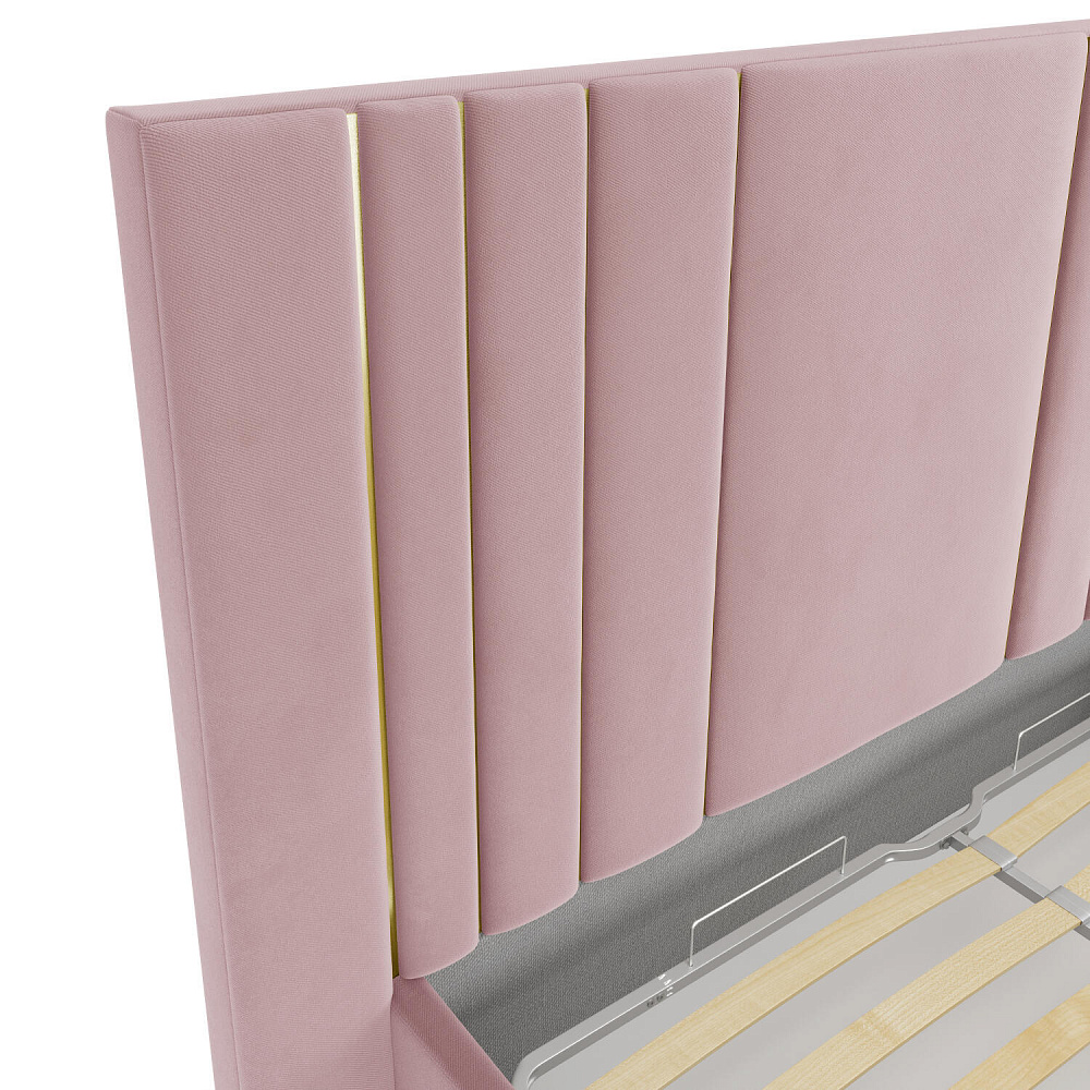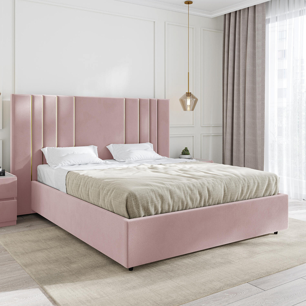 Мягкая кровать «Рания» создана для воплощения смелых интерьерных решений. Высокое изголовье декорировано узором из вертикальных металлизированных вставок, утопающих в изголовье. Под решёткой с подъёмным механизмом предусмотрен вместительный бельевой короб. Надежное основание и правильно подобранный матрас обеспечат необходимый уровень для здорового сна и отдыха.