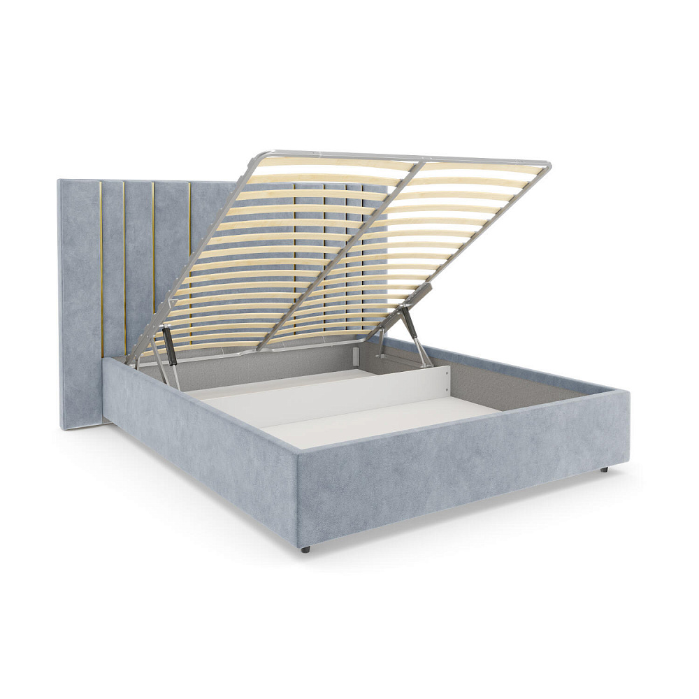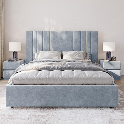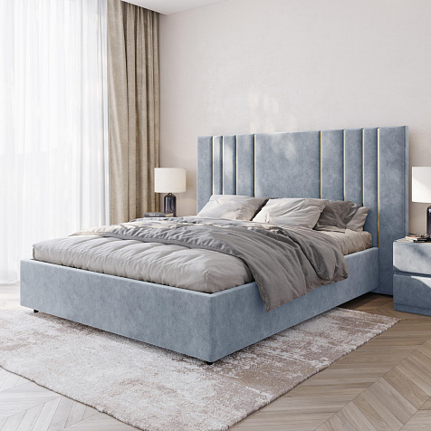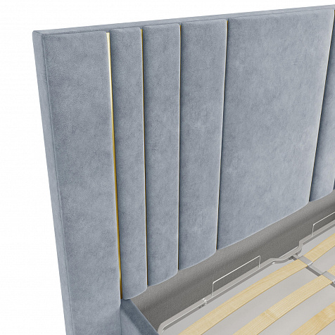 Мягкая кровать «Рания» создана для воплощения смелых интерьерных решений. Высокое изголовье декорировано узором из вертикальных металлизированных вставок, утопающих в изголовье. Под решёткой с подъёмным механизмом предусмотрен вместительный бельевой короб. Надежное основание и правильно подобранный матрас обеспечат необходимый уровень для здорового сна и отдыха.
