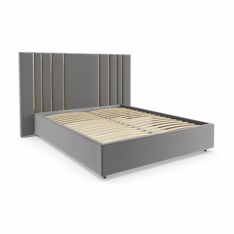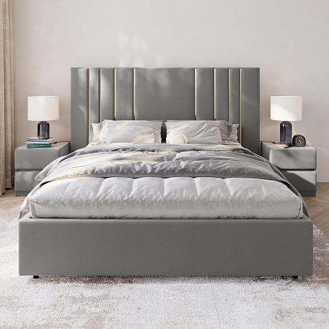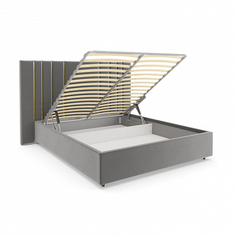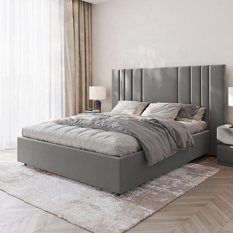Мягкая кровать «Рания» создана для воплощения смелых интерьерных решений. Высокое изголовье декорировано узором из вертикальных металлизированных вставок, утопающих в изголовье. Под решёткой с подъёмным механизмом предусмотрен вместительный бельевой короб. Надежное основание и правильно подобранный матрас обеспечат необходимый уровень для здорового сна и отдыха.