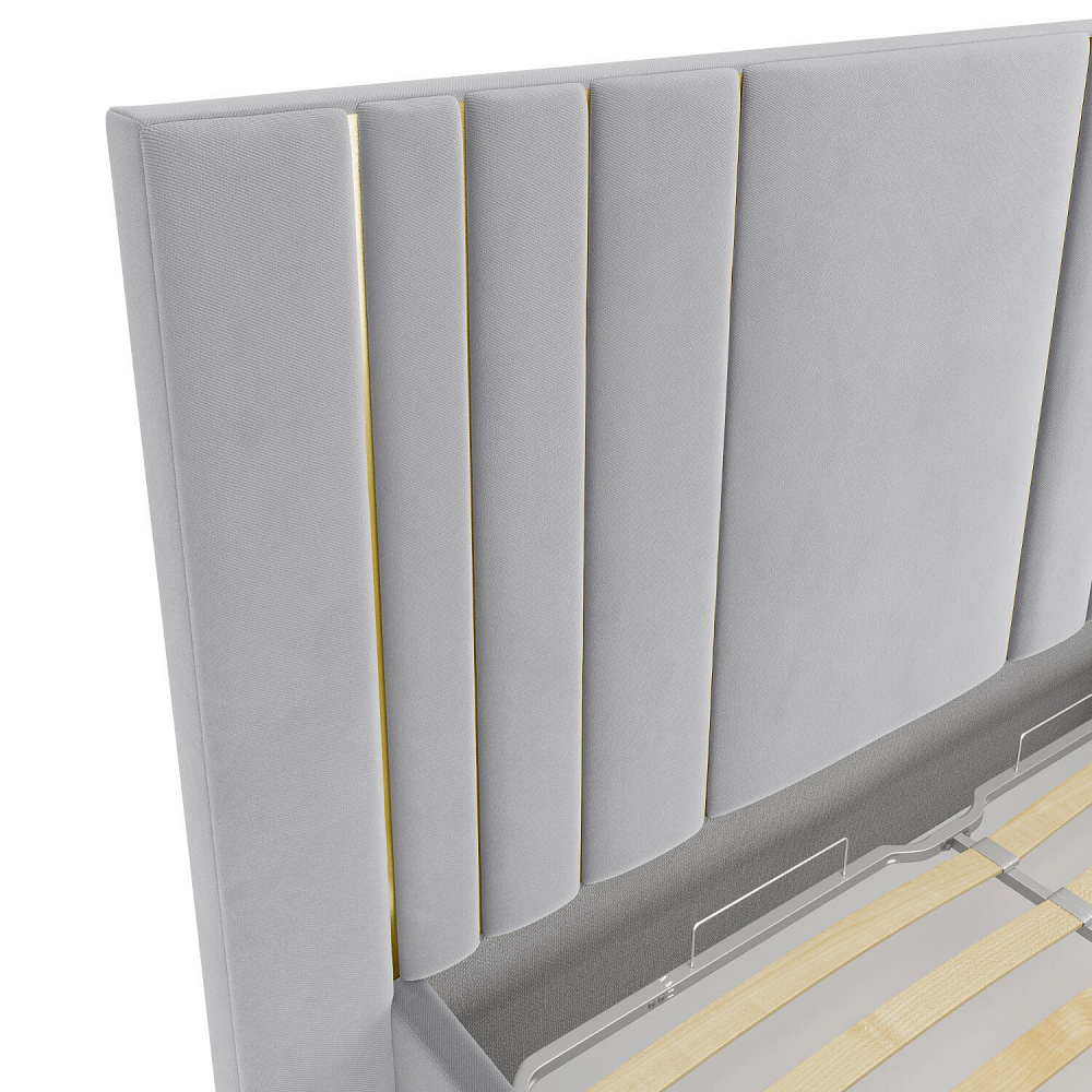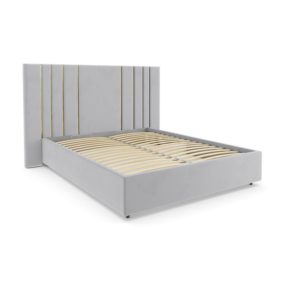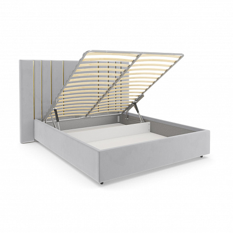 Мягкая кровать «Рания» создана для воплощения смелых интерьерных решений. Высокое изголовье декорировано узором из вертикальных металлизированных вставок, утопающих в изголовье. Под решёткой с подъёмным механизмом предусмотрен вместительный бельевой короб. Надежное основание и правильно подобранный матрас обеспечат необходимый уровень для здорового сна и отдыха.