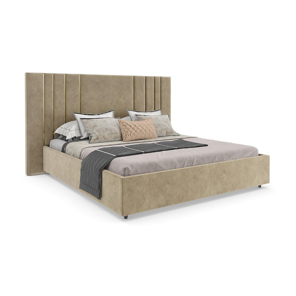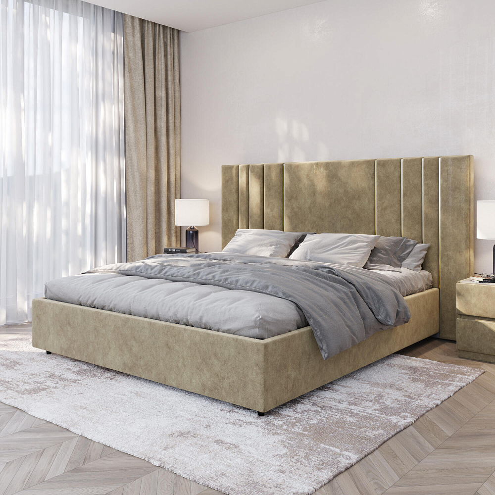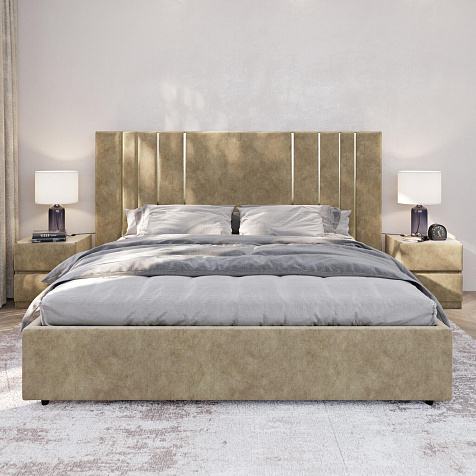 Мягкая кровать «Рания» создана для воплощения смелых интерьерных решений. Высокое изголовье декорировано узором из вертикальных металлизированных вставок, утопающих в изголовье. Под решёткой с подъёмным механизмом предусмотрен вместительный бельевой короб. Надежное основание и правильно подобранный матрас обеспечат необходимый уровень для здорового сна и отдыха.