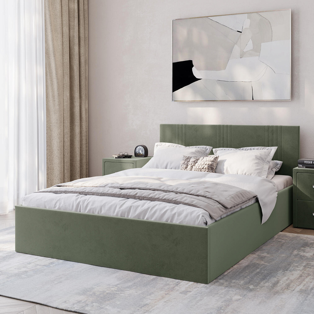 Кровать «Элис» выполнена в мягкой обивке из практичного и износостойкого велюра. Прямая спинка украшена декоративной стежкой, добавляющей стиля и динамики в интерьер. Особо прочный бельевой ящик позволит хранить в кровати даже самые тяжелые предметы и вещи. Надёжное основание и анатомическая решётка на подъёмных газлифтах обеспечат оптимальный уровень комфорта во время сна.