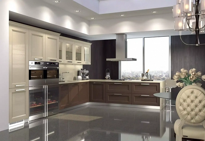 Рамные фасады Grassi из массива ясеня, сочетание бежево-молочного (RR38) и шоколадного (RR42) декоров, отделка фасадов – покраска.