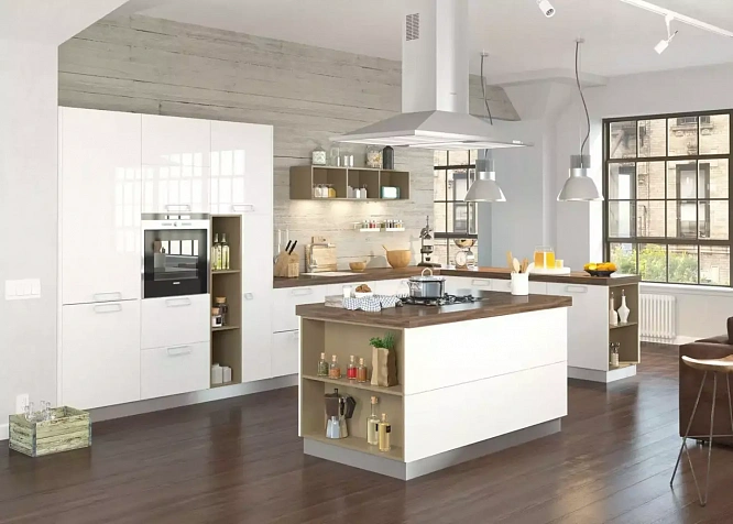 Безрамные фасады сделаны из МДФ в высокоглянцевой эмали "Белый".