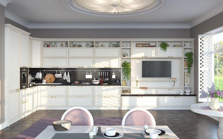 Когда помещение позволяет разместить большую кухню, можно дать волю фантазии и дополнить ее, например, ТВ-юнитом. Созданные в едином стиле, эти элементы будут уместны и добавят функциональности помещению. Приходите в Ателье мебели Mr.Doors за кухней мечты!