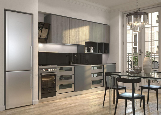 Обратите внимание, как вписана серая кухня на фото (цвет «Графит») в существующую нишу. Столовая группа (стеклянный стол и темная стулья) вкупе с необычной подвесной люстрой идеально дополняют интерьерный ансамбль помещения.