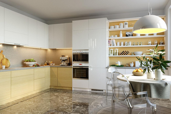 Кухня с белыми глянцевыми фасадами гарантированно увеличит пространство комнаты, отражая солнечный (утром и днем) и искусственный свет (вечером и ночью). С помощью декоративного освещения, предметов декора и отделки самого помещения можно преобразить белый в холодный и «стальной», а можно придать ему тепло майского дня.