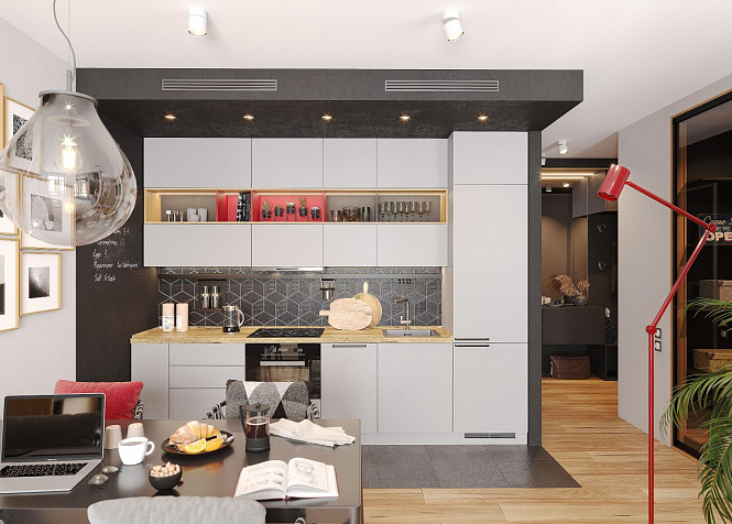 Контрастные ручки «Колибри» тёмного цвета заметно выделяются на светлом фоне. Тёплая светодиодная подсветка выделяет открытые секции. На части фасадов выступающие ручки отсутствуют, так как они открываются по нажатию (push to open). Использование качественной фурнитуры позволяет фиксировать откидные дверцы в открытом состоянии — это делает использование кухни более удобным.