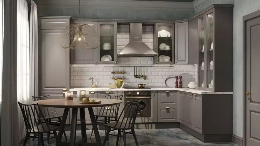 Красивая угловая кухня в неоклассическом стиле с витринными фасадами и буфетом подойдёт для любых интерьеров. Изготовление на заказ по индивидуальным размерам позволяет установить мебельную композицию и в просторном, и в компактном помещении, адаптировав количество и габариты верхних и нижних шкафов.