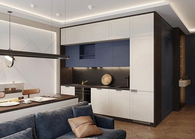 Кухня состоит из собранных в единый кластер просторных шкафов и рабочей зоны – столешницы, а также отдельно расположенных острова и подвесной консоли.