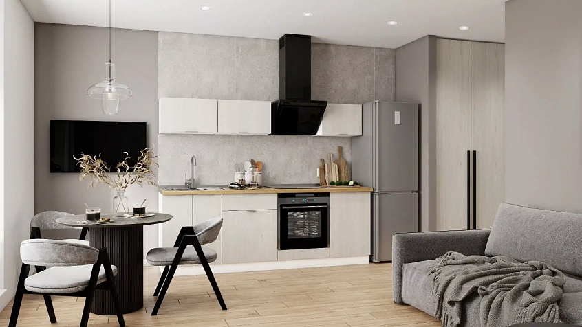 Добавьте вытяжку по своему выбору, практичный фартук с кухонной навеской, и ваша кухня преобразится!