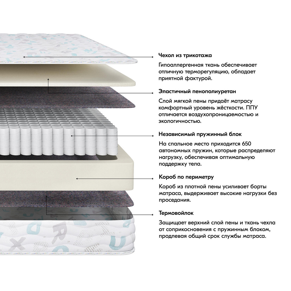 Независимый пружинный блок. На спальное место приходится 650 автономных пружин, которые распределяют нагрузку, обеспечивая оптимальную поддержку тела. Каждая пружина заключена в защитный чехол из спанбонда и принимает вес независимо от других пружин.