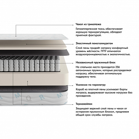 Независимый пружинный блок. На спальное место приходится 256 автономных пружин, которые распределяют нагрузку, обеспечивая оптимальную поддержку тела. Каждая пружина заключена в защитный чехол из спанбонда, а значит принимает вес независимо от других пружин.