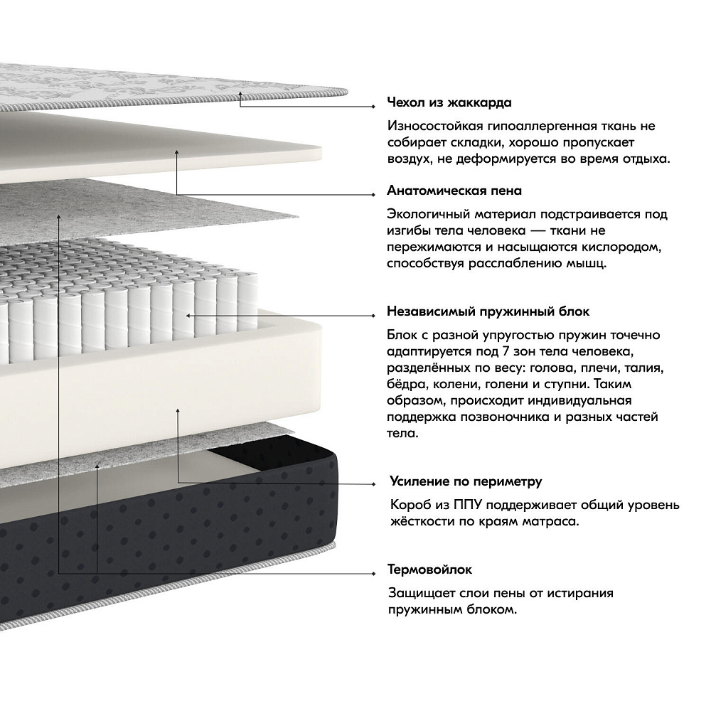 Независимый пружинный блок. Продвинутый блок с разной упругостью пружин точечно адаптируется под 7 зон тела человека, разделённых по весу: голова, плечи, талия, бёдра, колени, голени и ступни. Таким образом, происходит индивидуальная поддержка позвоночника и разных частей тела. Каждая пружина заключена в защитный чехол из спанбонда и принимает вес независимо от других пружин, что исключает эффекты «подкатывания» и «волны».