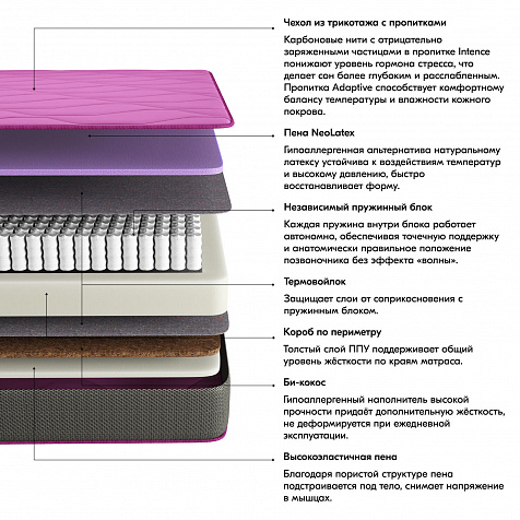 Чехол из трикотажа с пропитками. Карбоновые нити с отрицательно заряженными частицами в пропитке Intence понижают уровень гормона стресса, что делает сон более глубоким и расслабленным. Пропитка Adaptive способствует комфортному балансу температуры и влажности кожного покрова. Бурлет с 3D сеткой испаряет влагу и защищает от пыли, формируя особый микроклимат внутри и над поверхностью матраса.