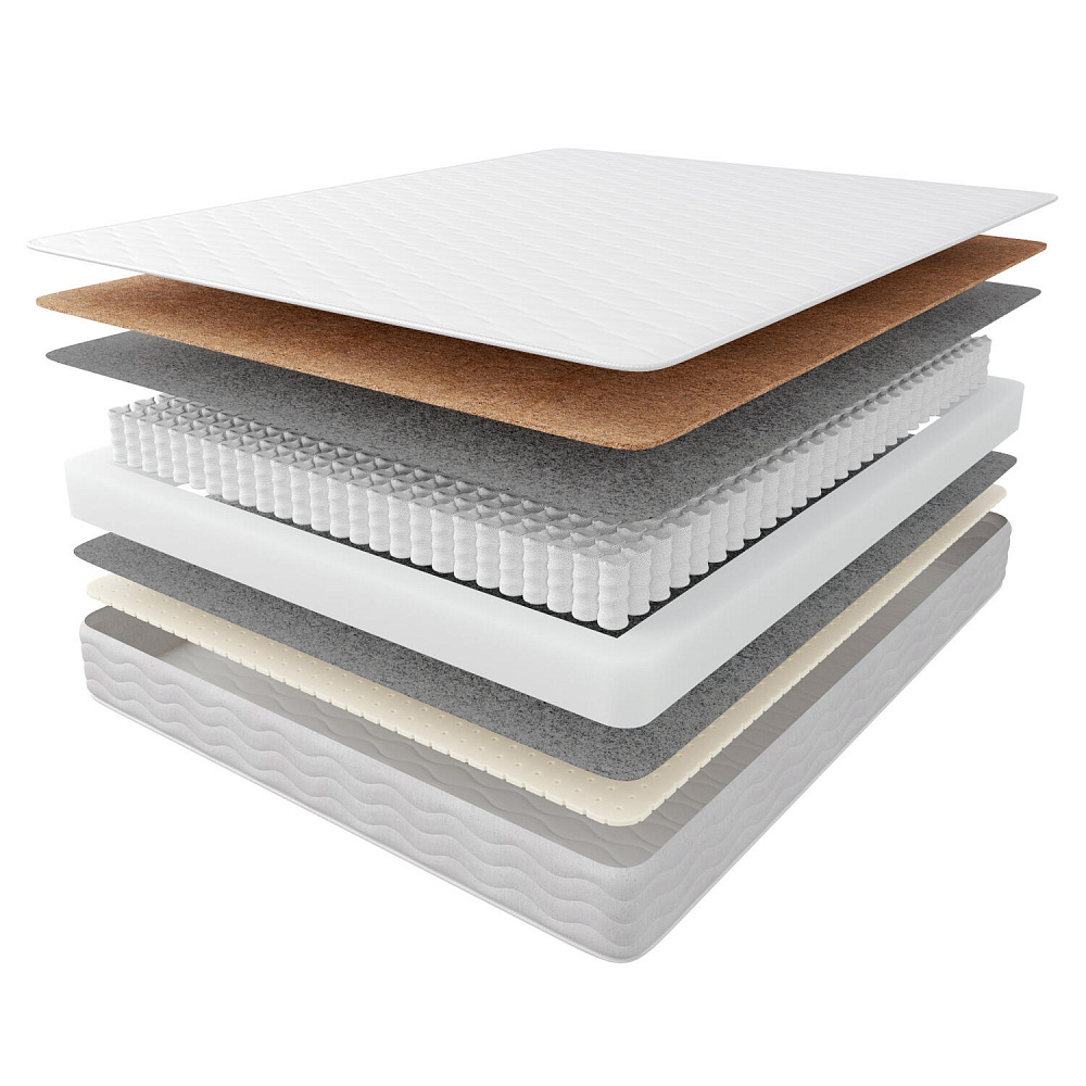 Кокос. Верхний слой высотой 1 см лежит на слое термовойлока с верхней стороны матраса, увеличивает жёсткость и прочность изделия. Природный наполнитель состоит из кокосового волокна.