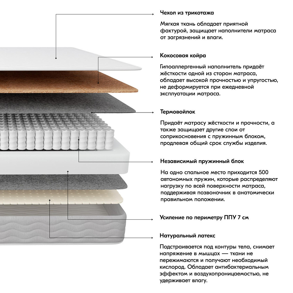 Натуральный латекс. Верхний слой высотой 1 см с нижней стороны матраса минимизирует давление от пружин на мягкие части тела.