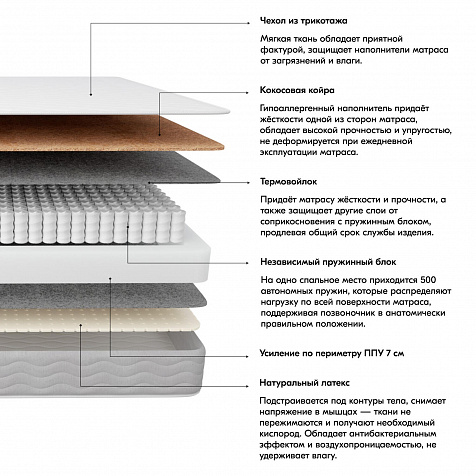 Независимый пружинный блок. Основа матраса высотой 14 см состоит из 500 пружин на спальное место. Каждая пружина производится из высокоуглеродистой стали на европейском оборудовании.