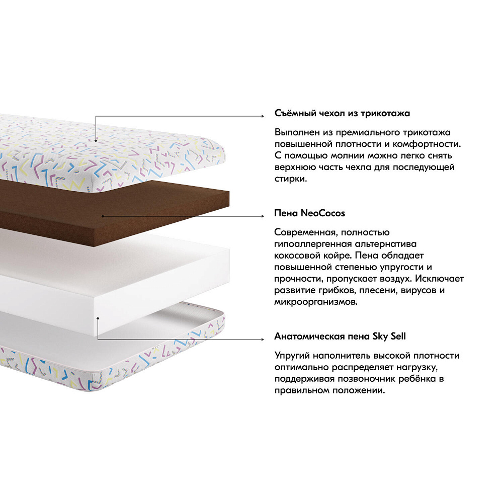 Двусторонний детский матрас Little Star с разными сторонами жёсткости поспособствует правильному формированию мышц спины ребёнка, вытяжению позвоночника во время сна. В основе матраса используется сочетание двух упругих слоев пен NeoCocos и Sky Sell с различными свойствами, обеспечивающими жёсткую поверхность выбранного спального места. Съёмный чехол из бельгийского трикотажа защищает чувствительную детскую кожу от неприятных ощущений.