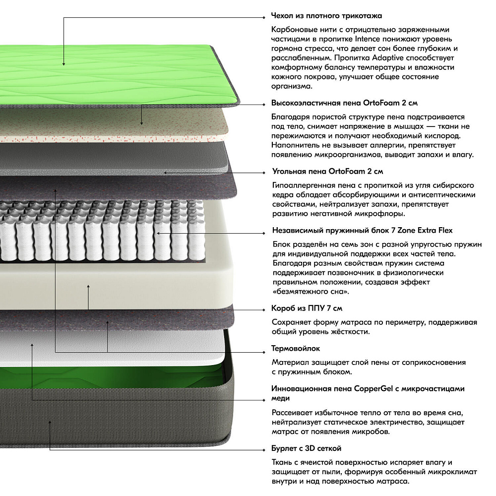 Чехол из плотного трикотажа. Карбоновые нити с отрицательно заряженными частицами в пропитке Intence понижают уровень гормона стресса, что делает сон более глубоким и расслабленным. Пропитка Adaptive способствует комфортному балансу температуры и влажности кожного покрова, улучшает общее состояние организма. Бурлет с 3D сеткой испаряет влагу и защищает от пыли, формируя особенный микроклимат внутри и над поверхностью матраса.