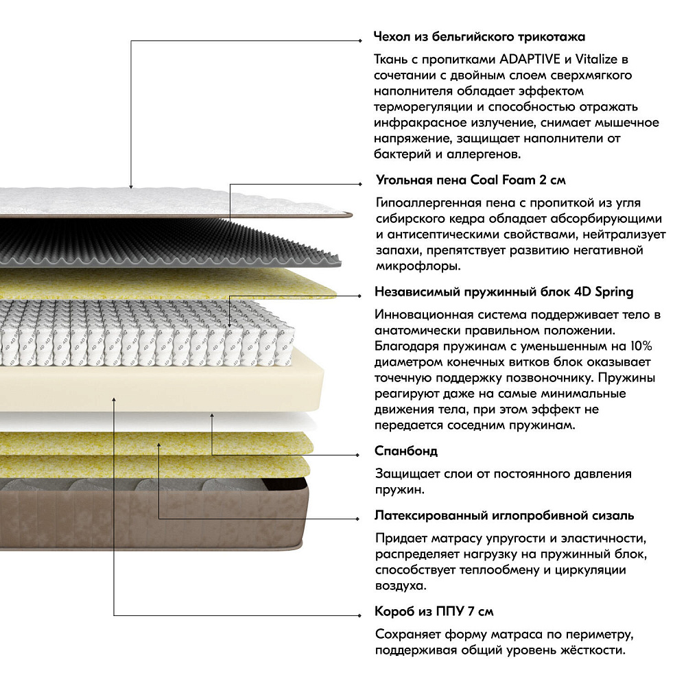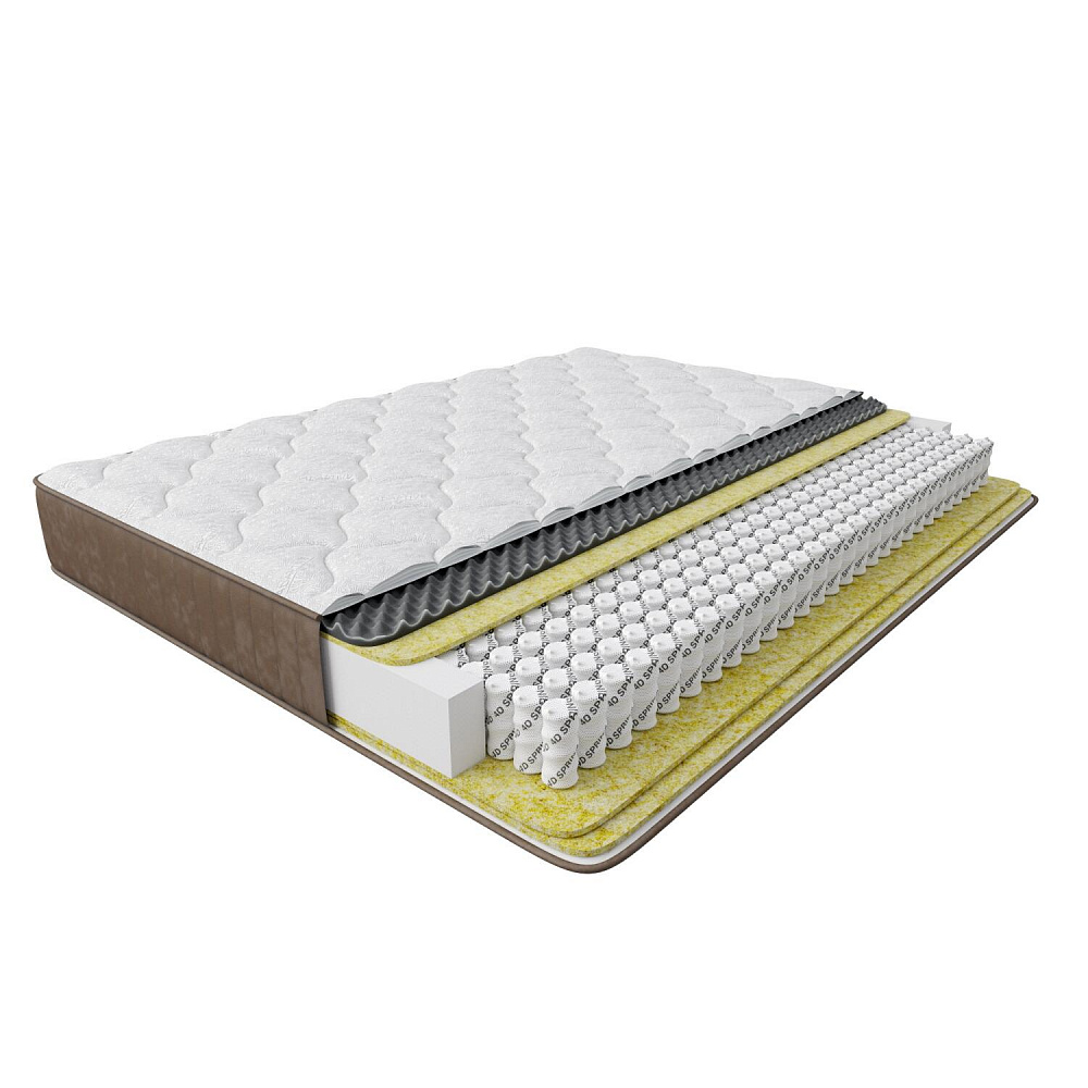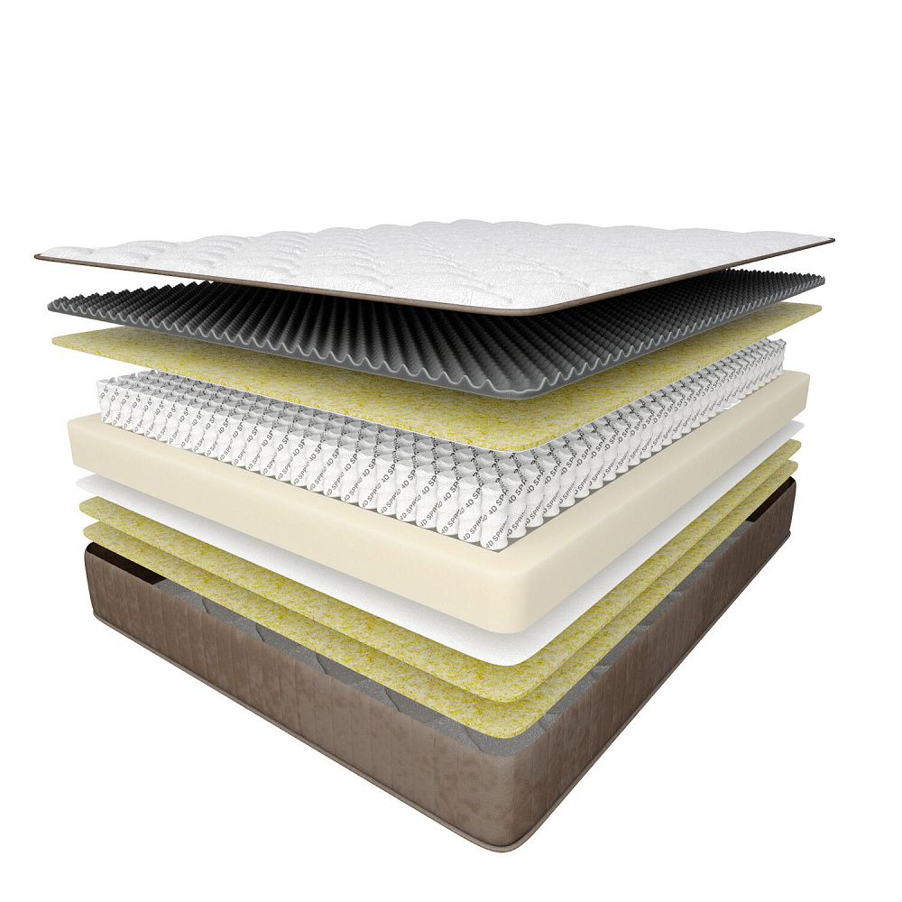 Независимый пружинный блок 4D Spring. Оказывает позвоночнику точечную поддержку благодаря стальным пружинам с уменьшенным на 10% диаметром конечных витков. Пружины реагируют даже на минимальные движения тела, при этом эффект не передается соседним пружинам.