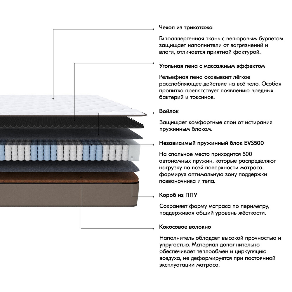 Независимый пружинный блок EVS500. На спальное место приходится 500 пружин, которые распределяют нагрузку по всей поверхности матраса, формируя оптимальную зону поддержки позвоночника и тела. Каждая пружина заключена в защитный мешочек и принимает нагрузку автономно от других.